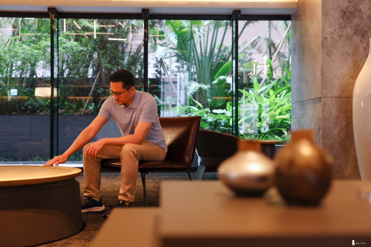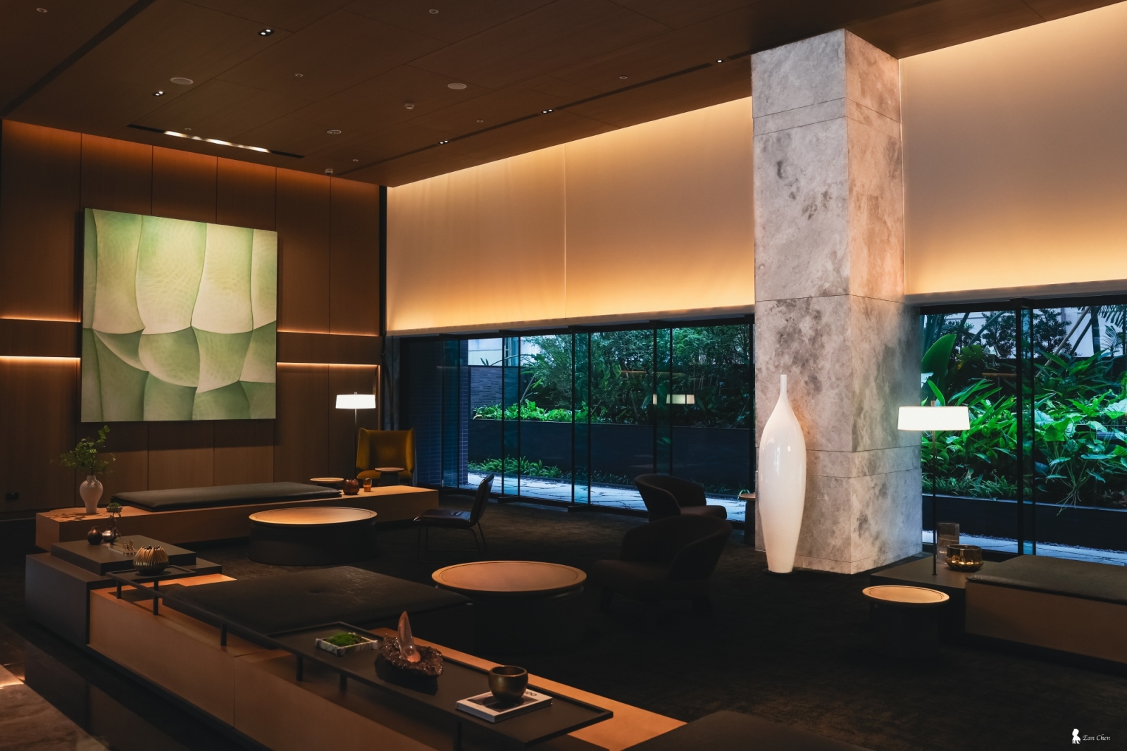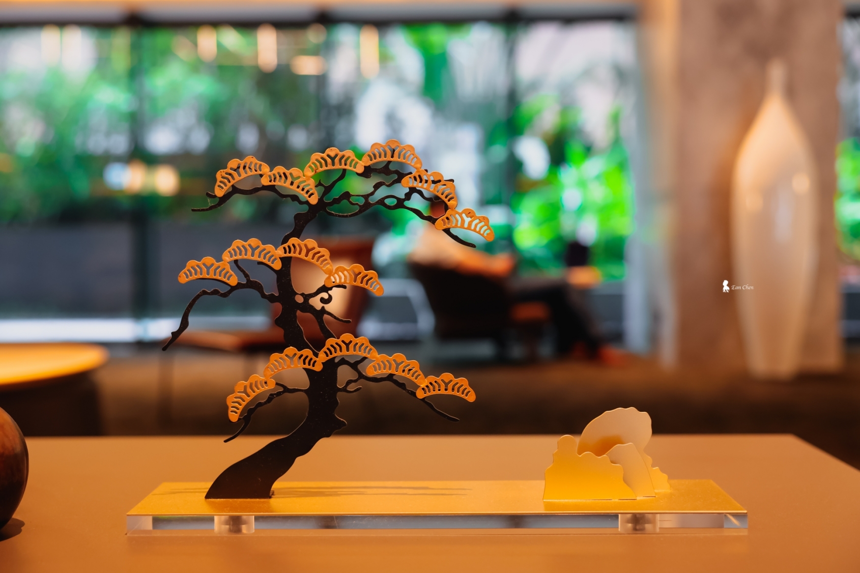 飯店鄰近捷運三多商圈,交通便利且生活機能完善。走入大廳,迎面而來是一長排半掩的綠意窗格,讓我立刻聯想到虹夕諾雅 京都渡月橋旁的候船室。日本人擅長「借景」,更擅長「藏拙」,整面牆只有下方部分為透明玻璃,引景入室、收放有度,是一種設計的分寸感。