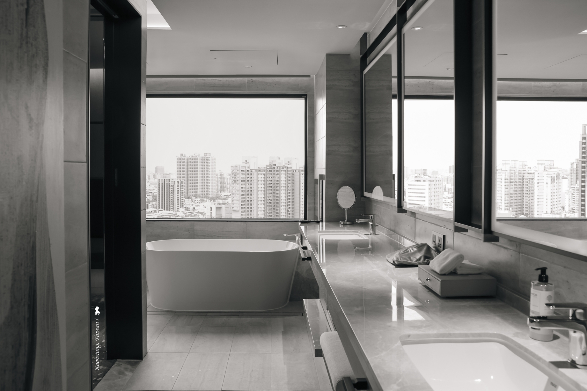 浴室區是這間套房的另一亮點。通往浴室的走廊式衣櫃比常見的 walk-in closet 更為寬敞,讓我能輕鬆攤開行李箱與攝影器材,動線順暢。浴室則是本房型的一大亮點。大片窗景讓自然光灑入,清晨起床盥洗時格外舒心。浴缸設有觀景視角,能在高樓層俯瞰城市景色,是一天結束後最療癒的收尾。