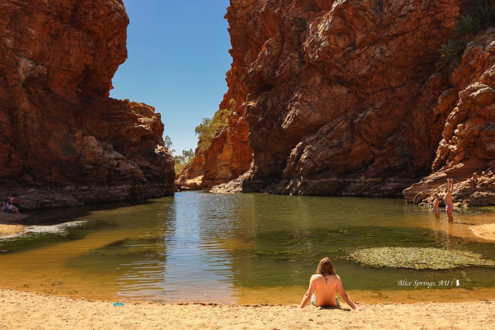 別以為愛麗斯泉就是個文青,其實看的、玩的可以很野!這日在愛麗斯泉遊覽西麥克唐納國家公園,司導忽然把車停在路邊,不是第一次、我知道眼尖的他,肯定又發現有動物出沒,還沒發現目標先趕緊把放在腳上的相機拿著衝下車,這回發現的是野生大蜥蜴,內心激動但需保持安靜並緩緩接近,那一刻,我像置身在國家地理頻道般的驚喜。四月的澳洲雖已入秋,但這裡因靠近赤道,白天仍非常燥熱,附近沒有泳池,那就來到艾勒里溪大水潭(Ellery Creek Big Hole),荒郊野外的哪裡有更衣室,隨意找棵樹當掩蔽、上衣脫掉換上衝浪褲,躍入沁涼深潭暑氣全消,再從大石跳下炸的水面開花,這就是北領地,不管吃或玩,天然尚好,快樂可以來得好簡單!
