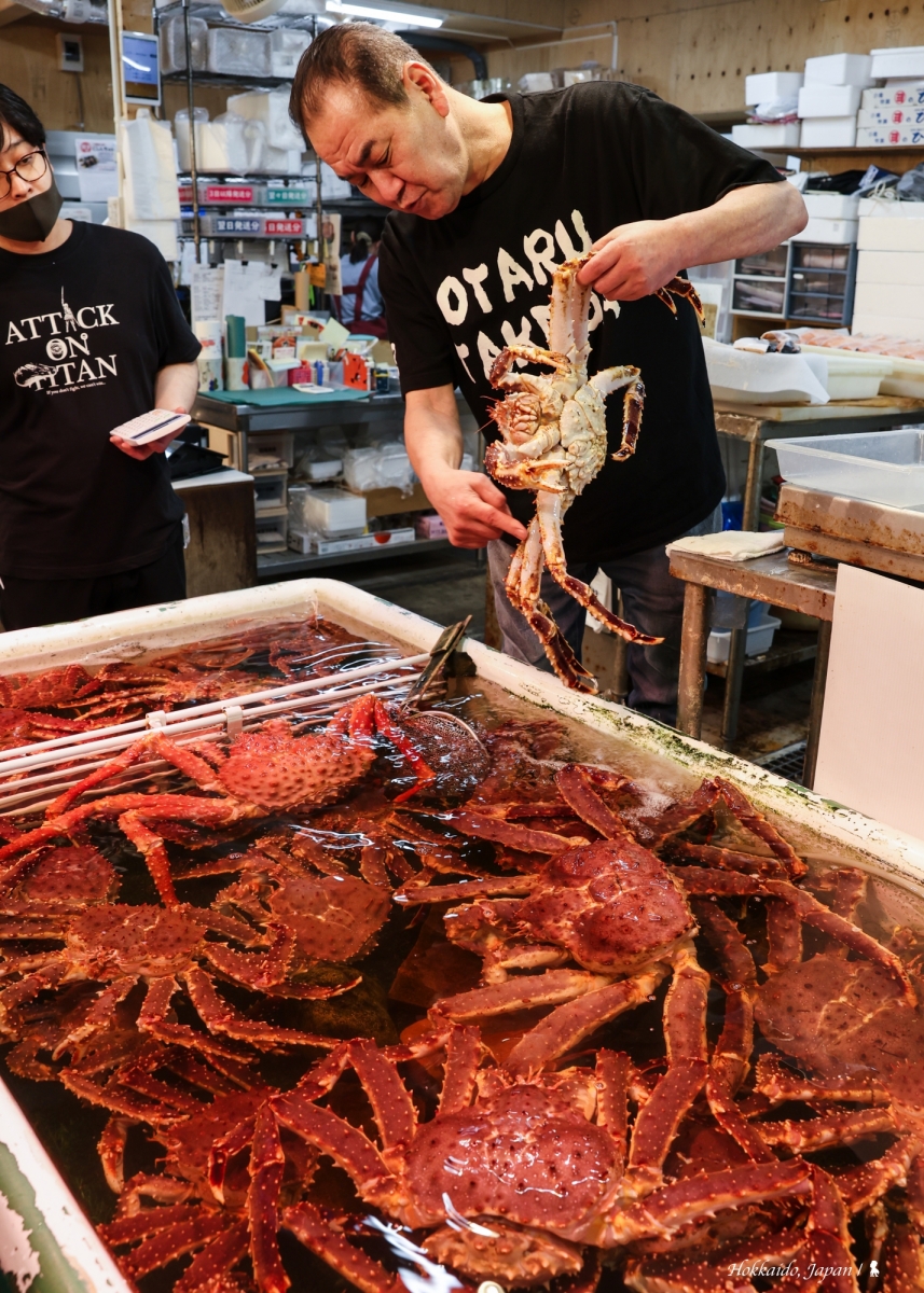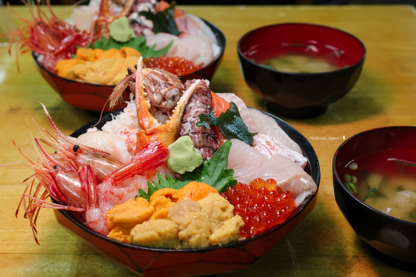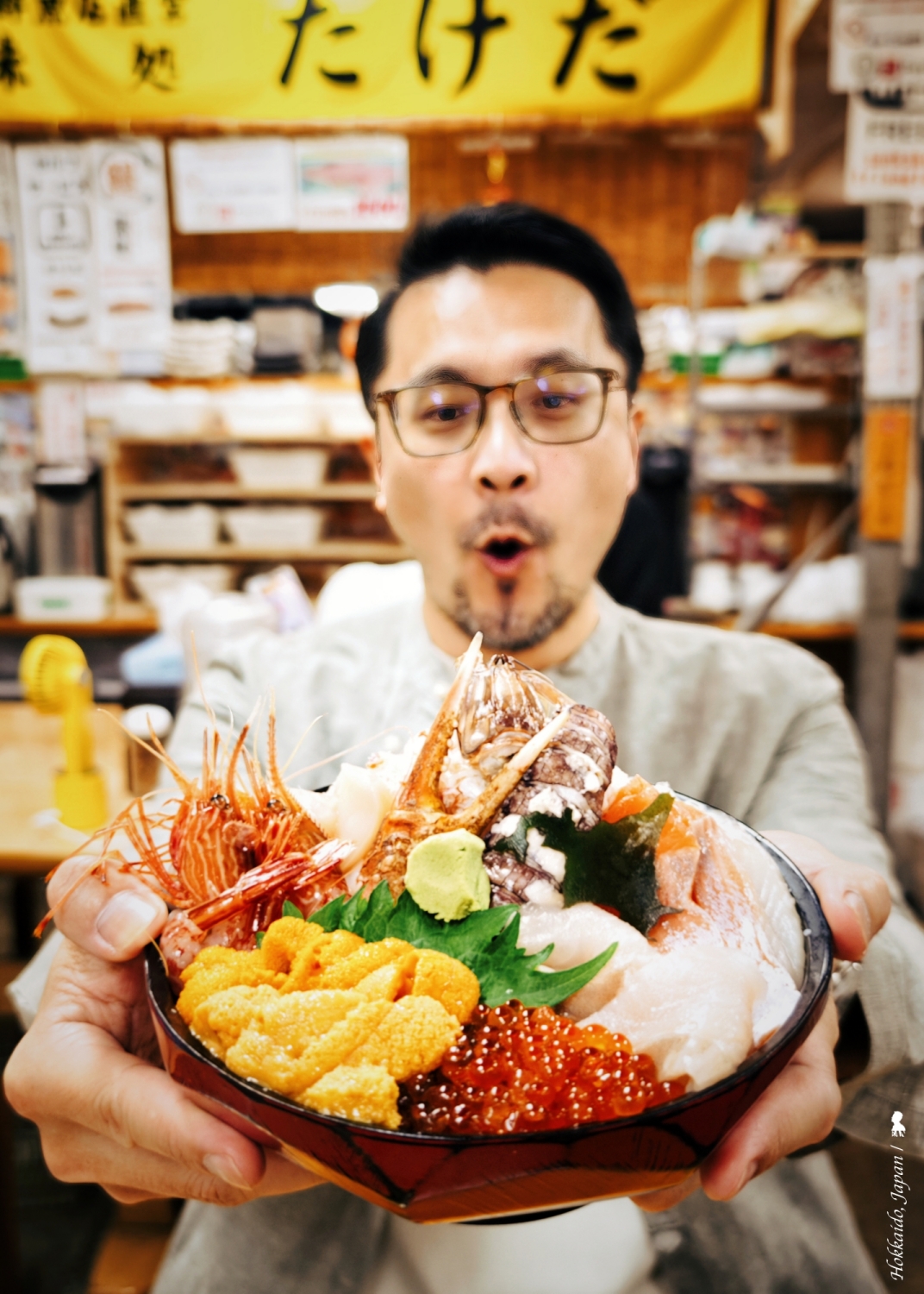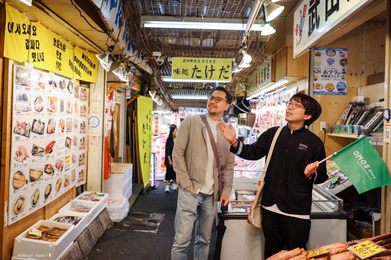 第二天早餐,再由 OMO Ranger 帶路來趟朝市的海鮮蓋飯之旅,這是飯店的付費館外活動,每人 4500 日幣,每天至多接受 4 位房客報名,費用包含一碗鋪滿各種海鮮的豪華蓋飯,地點就在小巧可愛的小樽三角市場。海鮮蓋飯會有哪些料也可說是一期一會,因為都是使用當天競拍採購的時令海鮮,像是若在海膽季的 6 – 8 月前來,就有機會跟我一樣一次嚐到兩種海膽,另外還有美味的福客魚,據說也只在這裡會做成生魚片食用。