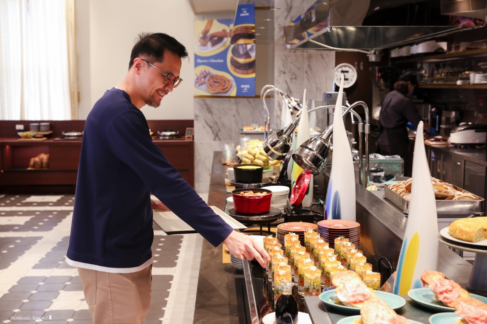 若跟我一樣連泊兩晚,早餐可考慮一日內用、一日外食。飯店提供的是西班牙式自助早餐,早餐就在夜晚會點亮油燈的原小樽商工會議所大會議室享用,之所以用西班牙為主題,是因為餐廳所在的南館是歷史建物,可能是前往西班牙旅遊多會安排在古蹟裡用餐,因此有了這樣的浪漫連結,餐檯上的西班牙烘蛋與西班牙經典甜點吉拿棒都很受房客歡迎,加上北海道在地食材,料理豐富而多元,讓一天開始有了好心情。