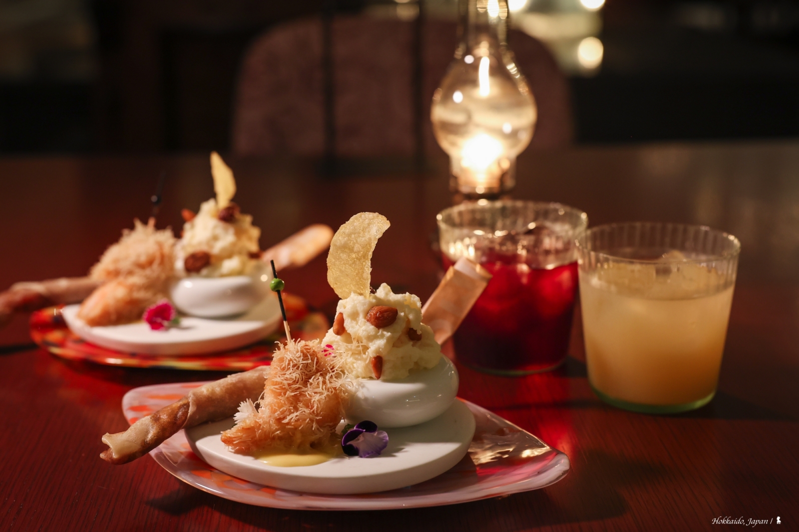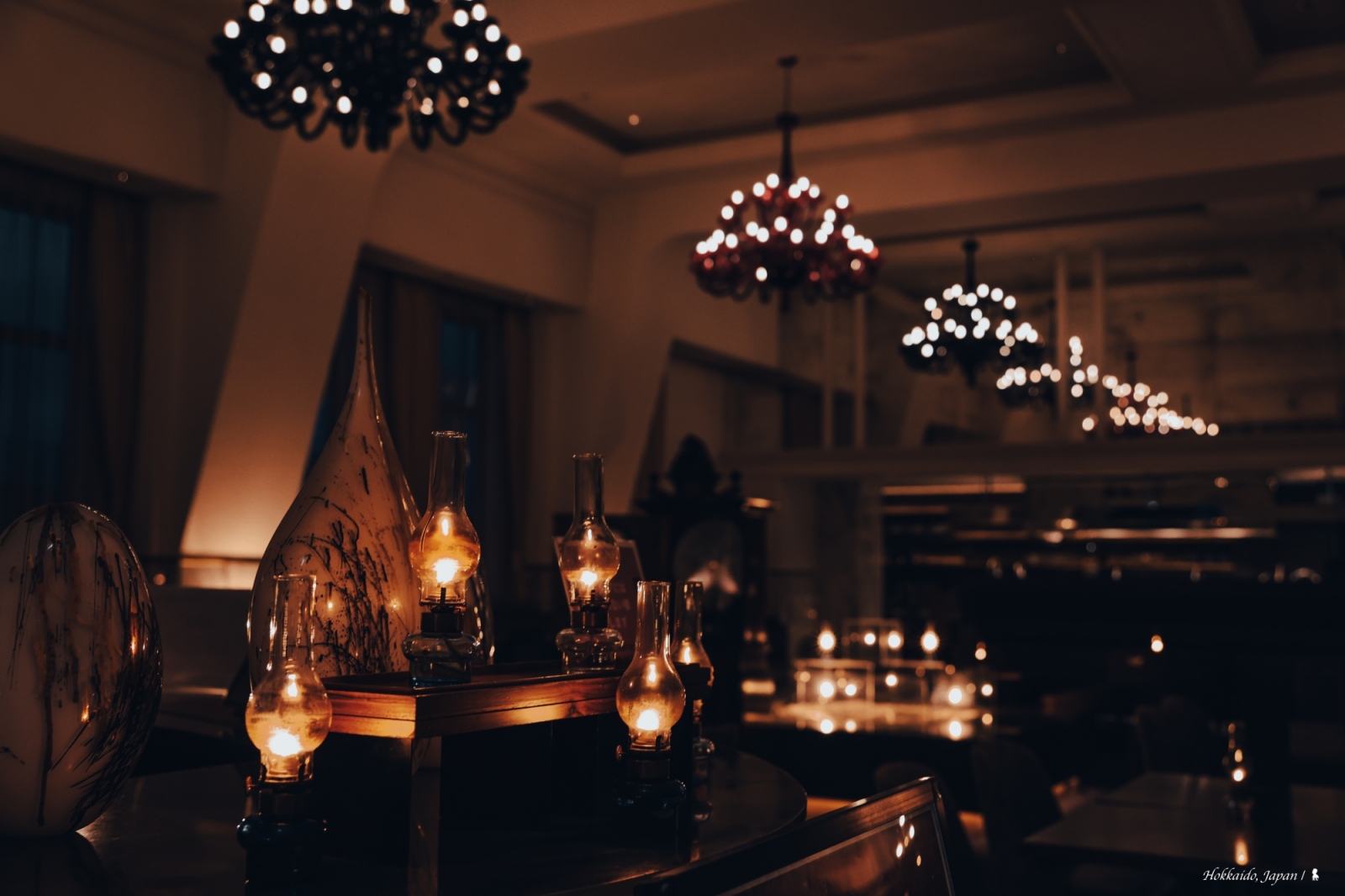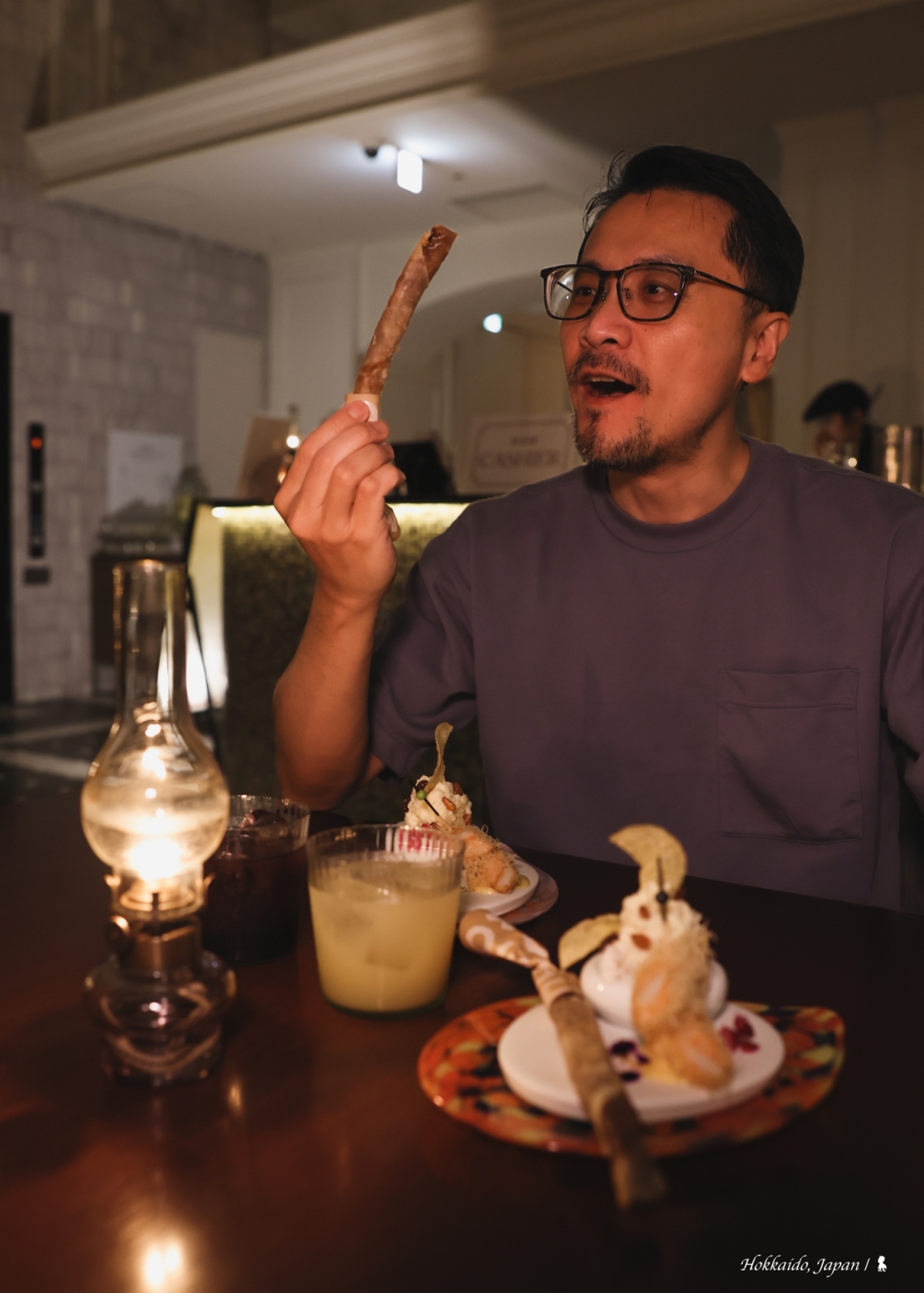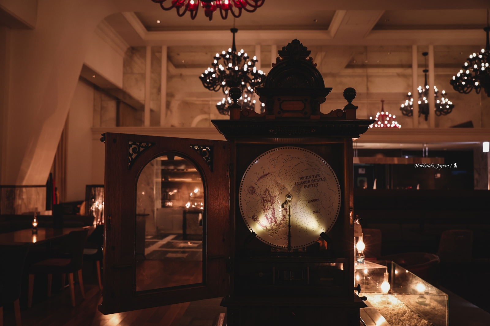 與上次入住不同,位於老建築南館 3 樓、原小樽商工會議所大會議室改建而成的挑高空間,後來改成了「OMO Cafe & Bar」,晚上 8 點後會點亮北一硝子的油燈(直到 23:30),同時每 30 分鐘就會輪流讓多台百餘年前製作的古董音樂盒現場演奏,非常有味道,而晚上這段期間,房客可自由進入並能免費享用果物風味水,當然也有多款酒水、美味的小樽特色輕食像是成吉思汗春卷、魚糕及甜點可供點用。懷舊而優雅,若有入住記得一定要抽空享受一下搖曳樂光。