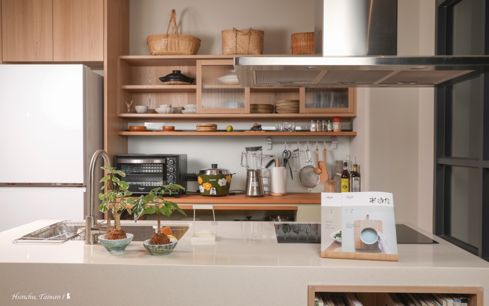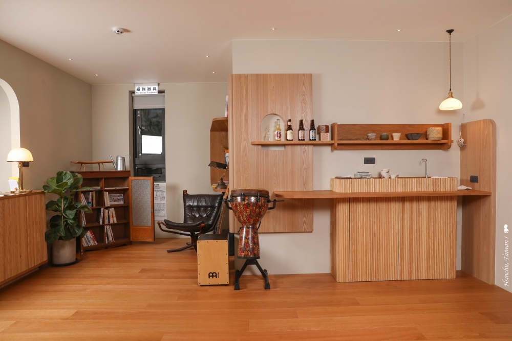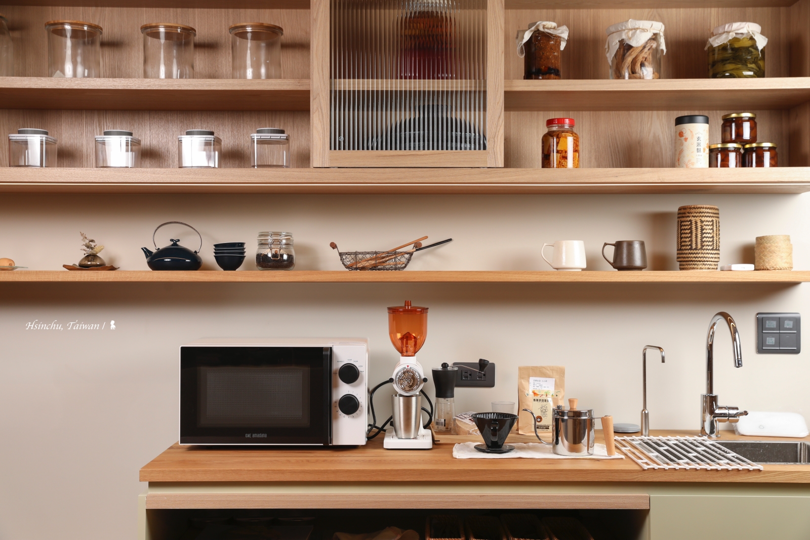 三樓這個融合圖書與音樂的空間,舒服的足以讓人待上整天,不過難免好奇,那四樓的公共空間又是什麼樣?可搭電梯或拾階而上,若喜歡在旅行時到當地市場買些食材下廚,肯定會喜歡四樓的開放式廚房,就算不擅廚藝如我,也會忍不住想趕快自己磨豆、手沖一杯咖啡來品嚐。這裏也是房客吃早餐的地方,早餐由管家自己動手準備,除了健康味美,也加了在地巧思,像我這早就吃到塗抹豆腐乳醬的山東大饅頭切片,那讓我想到前些日子才去參觀過的新竹眷村博物館,他們把在地的歷史文化,也讓房客用味蕾給品嚐了。