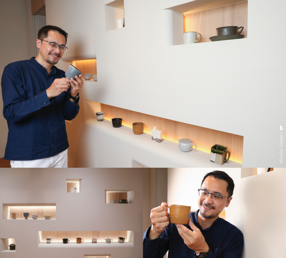 我隔天換到同在三樓的對面房間:穿城風,那是以老城區為概念所設計的房間,裡頭擺放了阿嬤的櫥櫃,帶有古味的五格屜,很自然的、我第一時間湊去看這間選放了哪些書,有街屋主題、風土經濟學等,都扣緊著老屋欣生,當初光是選書,就不知花了多少心思。同樣用心的,還有選物,許多用品與飾品,是來自附近的「或者工藝櫥窗」,不管優雅或質樸,皆具質感,他們希望傳達給房客的是,那些物品其實都能很貼近生活,並可藉此創造美好的使用體驗,這種大方的分享與給予,讓人欣賞與感謝。此外,辦理入住時,管家還會帶領房客先挑選一只獨一無二的陶藝家手作品,那將成為入住期間專屬使用的杯子。