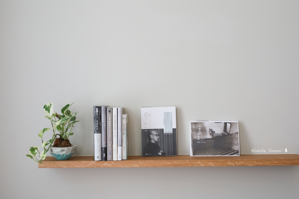 五間房的命名,是本地長大的邱佩柔店長依據童年經驗與在地觀察所發想。我連住兩晚,第一晚入住的是溪谷風,店長說小時候他們家會去內灣烤肉,於是印象中河床上的灰色大石頭,就變成了房間的混泥土牆壁,灰色,同時還成了鋪在棉被上的床巾,下方床墊則是好睡的「眠豆腐」。讓我更驚喜的是,架上陳列的書,封面或書背也清一色是灰色系,書的主題亦多與水有關,來呼應溪谷。