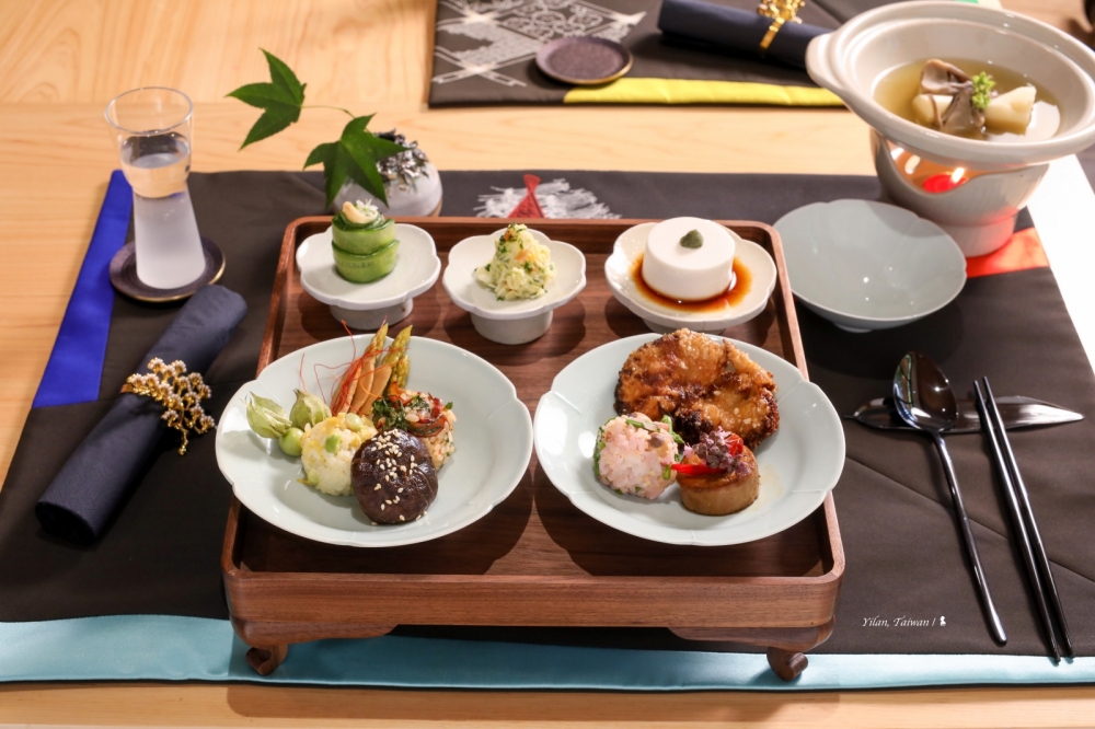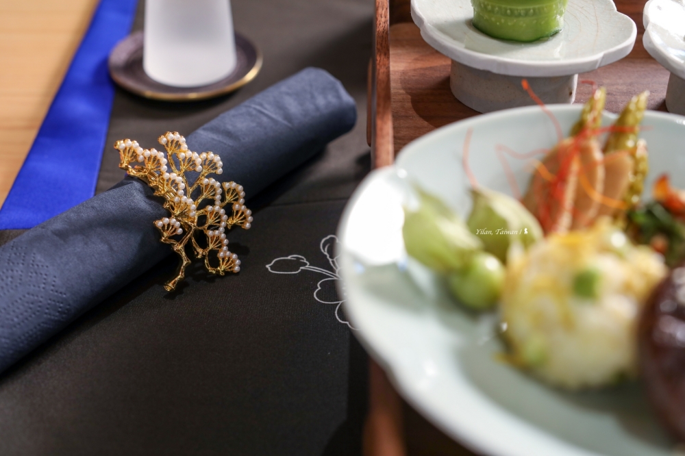 一樓的華美空間主要提供給客人用餐,還沒入座我就先注意到很不一樣的餐墊,那是潘設計師利用和服的再創作,每件都是獨一無二,也包括現場服務人員的手工訂製制服。餐具,也是一樣講究,葵花宋窯、青瓷,溫潤而脫俗。雖非餐館但這的料理完全不馬虎,那源自主理人對烹飪的熱愛,提供的是具日本味的旬味蔬食普茶料理,跟我曾在京都吃過的精進料理有些不同,該派別素餐的烹飪手法較多元,即便少吃素的人相信也都能嚐得津津有味。