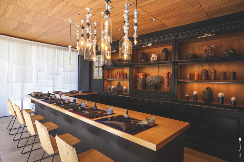 小隱於市的初能共有 6 層樓,一樓空間可說是呈現跨界的法蘭西和風,法國、日本與中國古典幾種風格在此被融合的恰到好處。歐洲燭台倒置的吊燈下,有一整面法國櫃,特別吸引我目光的是一位法國藝術家的陶藝作品,那是法國人眼中的中國茶罐,可用來存放普洱茶餅,此外還有火山陶藝作品、昭和時期的屏風等收藏,這裡,就像一間很具風格的私人藝術展館,值得細細品味。