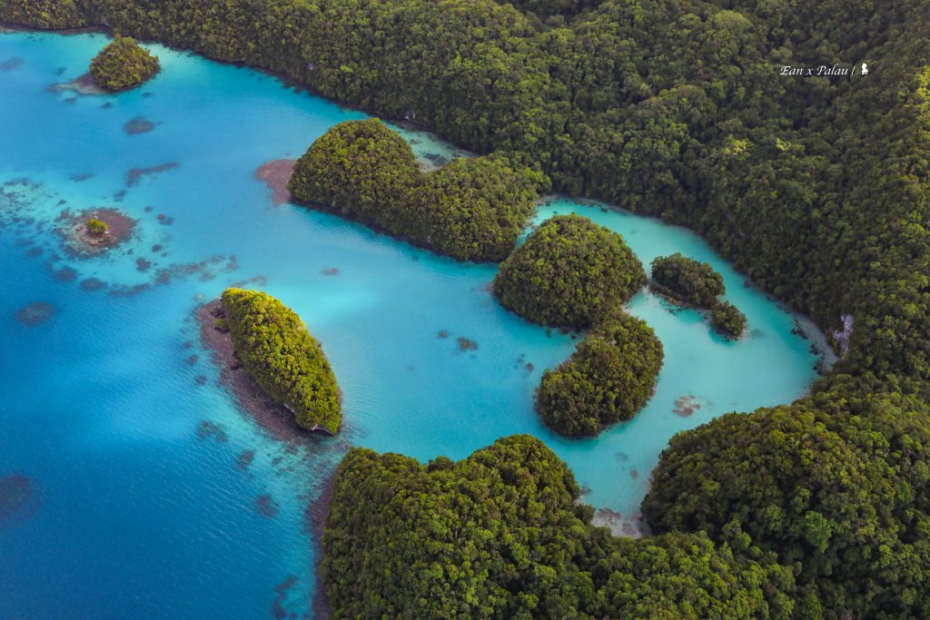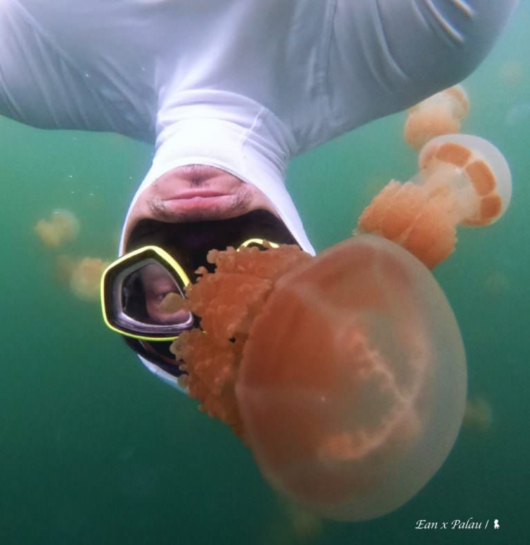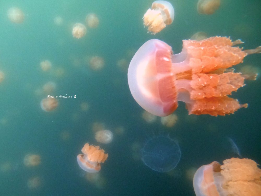 搭船前往,下了船需先在碼頭舀水淨身,用意是要盡可能避免遊客把身上的微生物帶到水母湖裡,更需提醒的是,這裏嚴禁塗抹防曬乳,若怕曬可從穿戴下手。經過一小段樹林健行後方可見到長 400 公尺、深 30 公尺的潟湖一座,因地形特殊,湖裡的水母少了天敵海龜,進化成無毒水母,全球只帛琉有。若造訪時值晴天,金黃色的梅杜莎水母會浮上接近水面,我搭小飛機經過水母湖上空剛好出太陽,當時真像上帝灑了一撮橘色粉末在湖面上,太驚喜。而這可愛的水母,當要離境時,還會被蓋在護照上作為永久的留念,水母章可說是帛琉送給遊客的最棒餞別禮物啊!