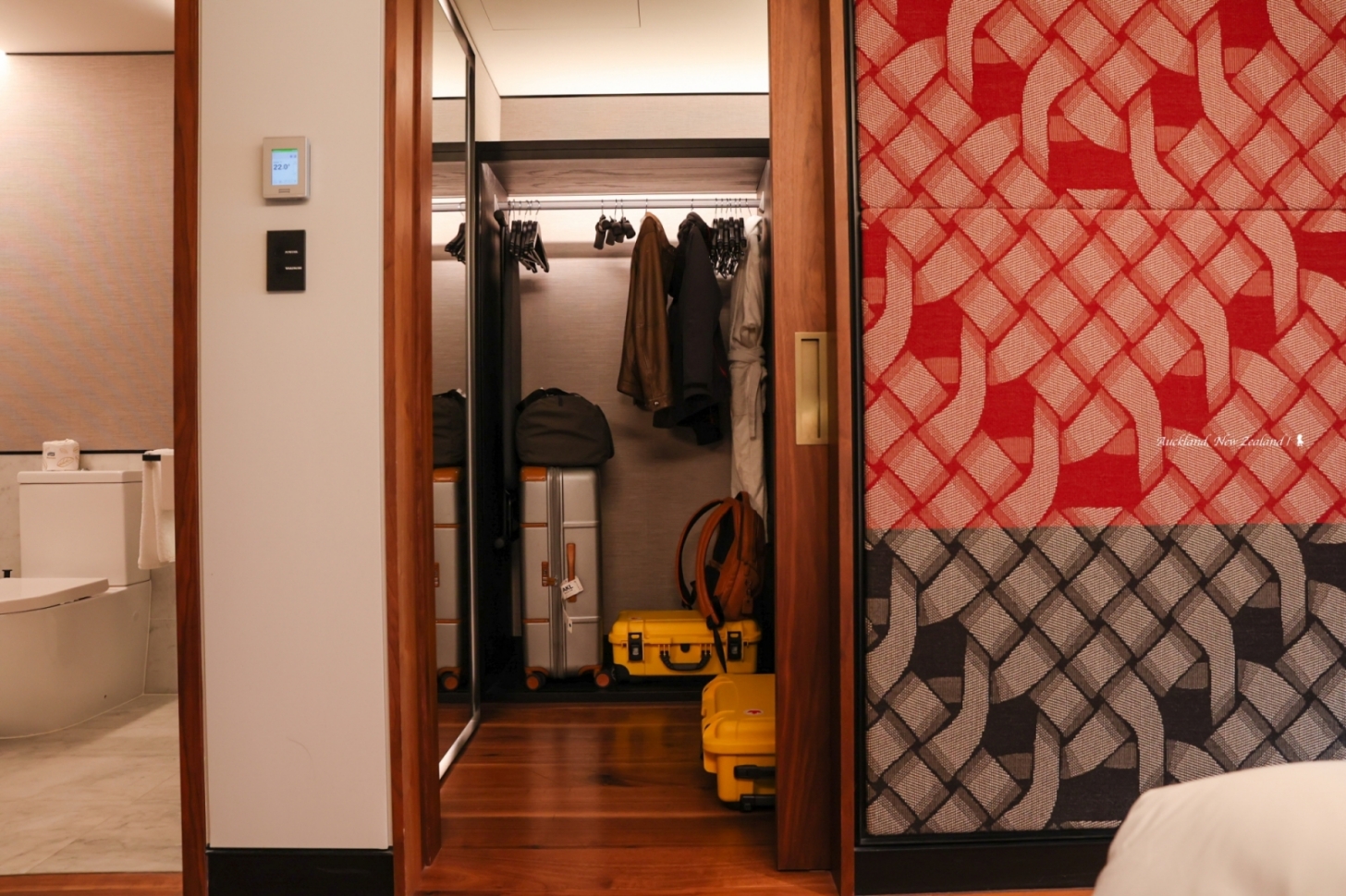 ⇑ 很合用的走入式衣櫃,外頭紅灰布面靈感是來自毛利人的傳統編織圖騰