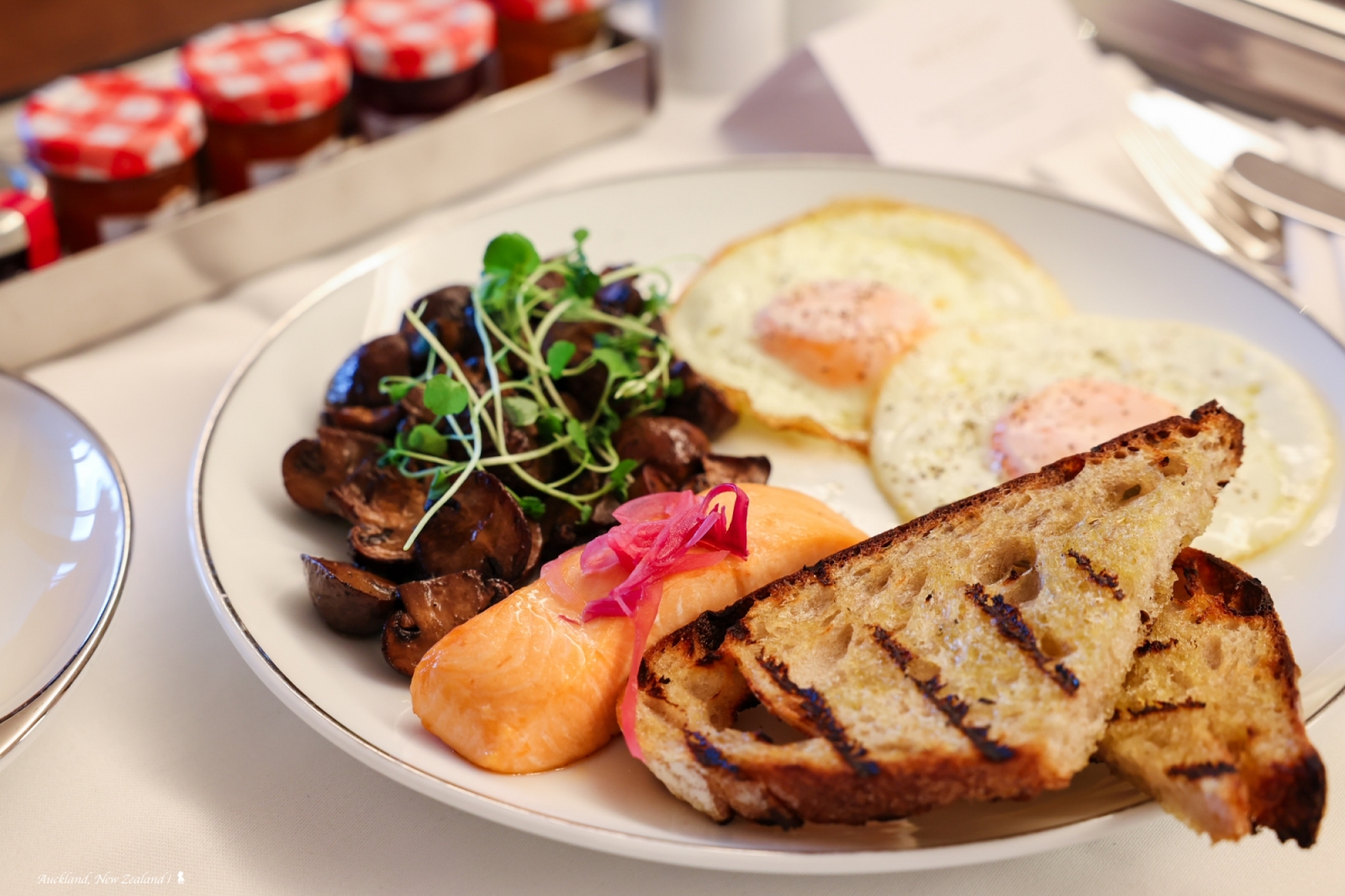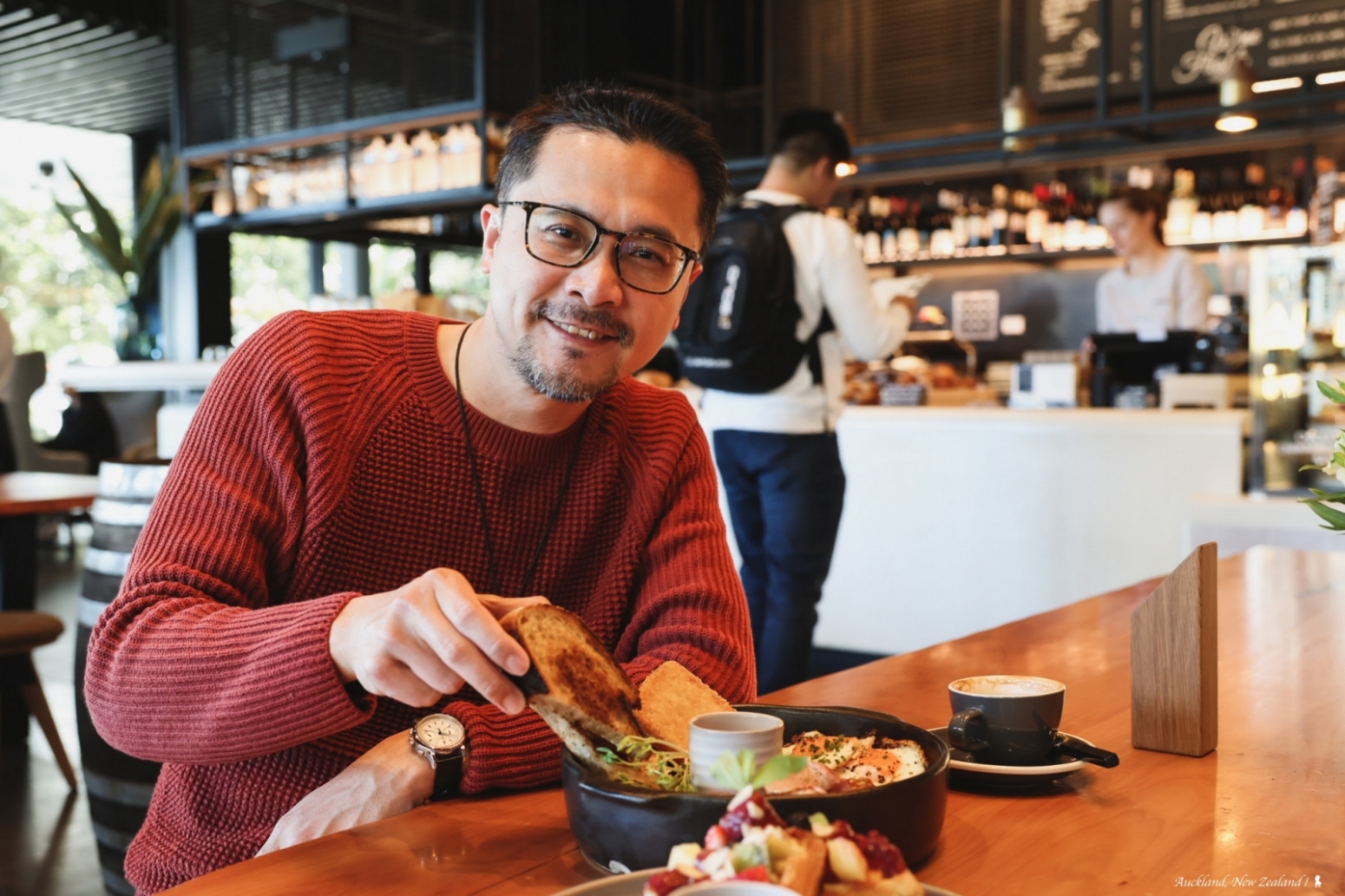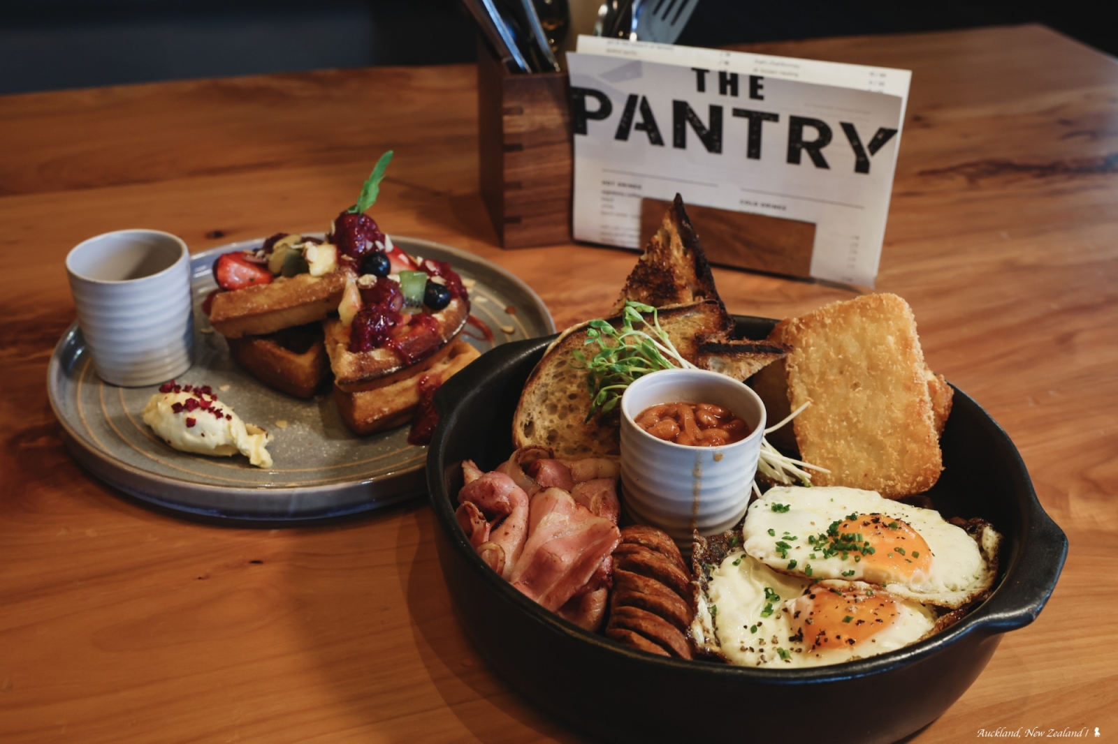 前一天早餐叫 Room Service,隔一天早餐,換到飯店裡一間對外開放的餐廳「The Pantry Auckland」,空間明亮、挑高寬敞,帶些輕工業風同時融合了一些傳統居家感,我蠻喜歡,重點是,食物還真的蠻好吃耶!來到紐奧,當然是要點杯在地風味的 Flat White,這個早晨滿足了。