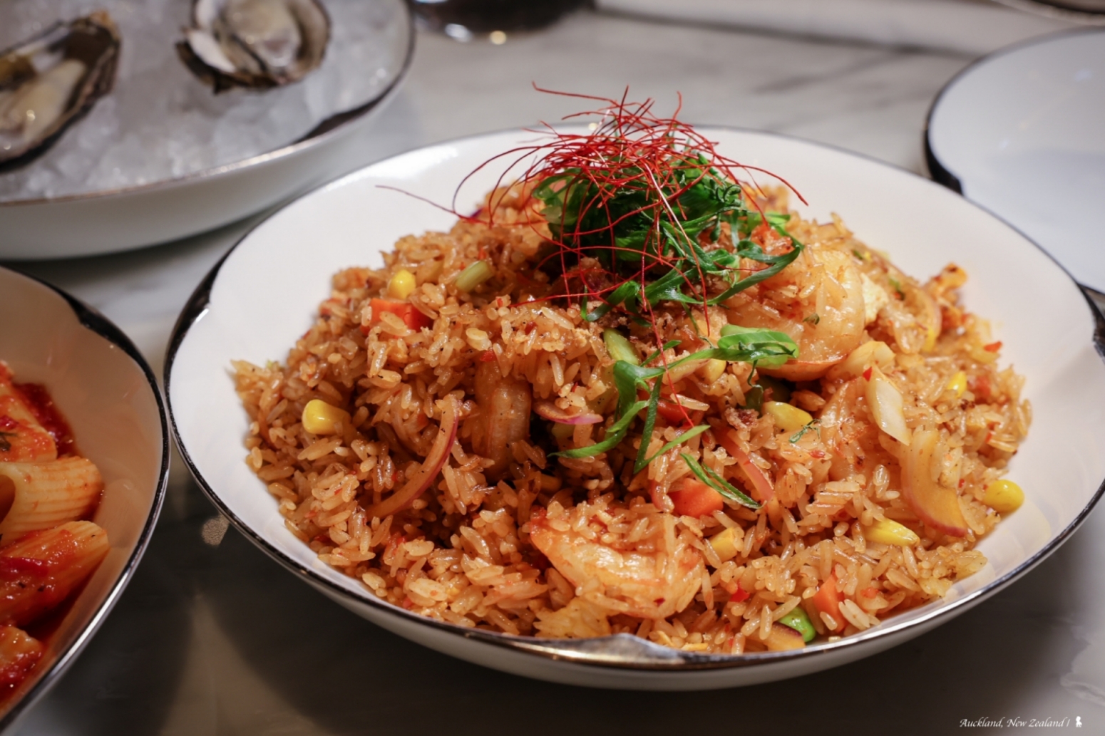 位於飯店大廳樓層有個面向港口的空間我蠻喜歡,取名 Living Room,但較可惜是這個客廳是需要消費,畢竟房價已經蠻高,若能免費提供一些茶食就像每間虹夕諾雅都會有的 The Library 那樣,我覺得會更很棒,不過還是蠻值得來坐坐。住好飯店,很享受的一點是當結束外頭一天行程,回到房間休息盥洗一下,就可直接搭電梯下樓輕鬆用餐,第二晚就是來客廳坐坐,簡單吃個晚餐。外頭是華燈初上的奧克蘭,室內空間相當舒服、服務也得宜,食物部分能在海外吃到有鍋氣的炒飯是幸福的事,加碼點的生蠔雖個頭不大倒也脆甜,雖未驚艷但有一定水準。