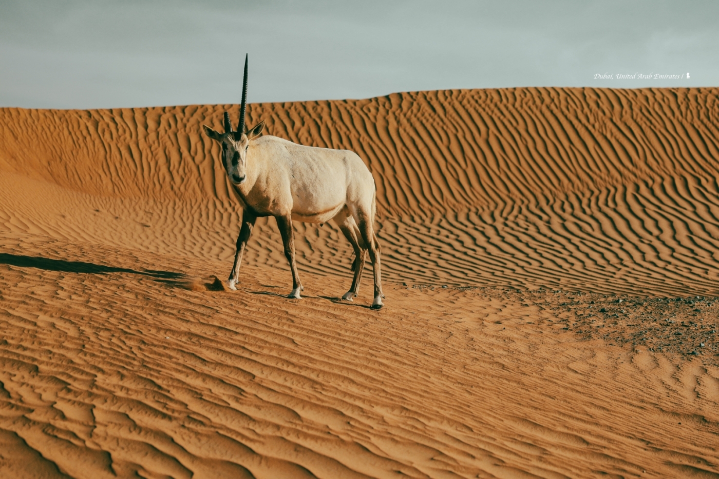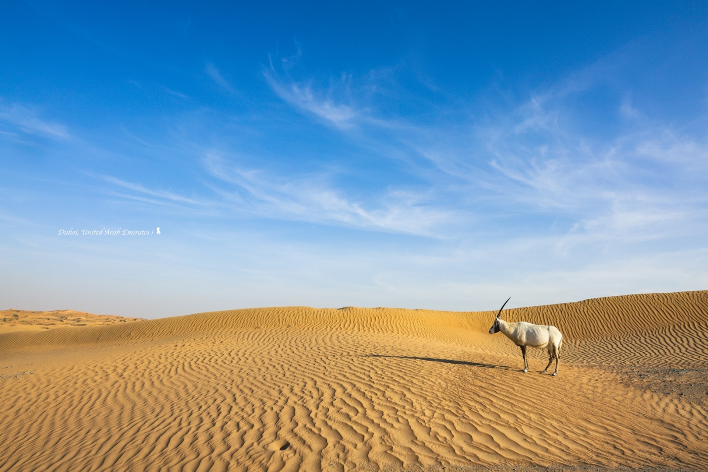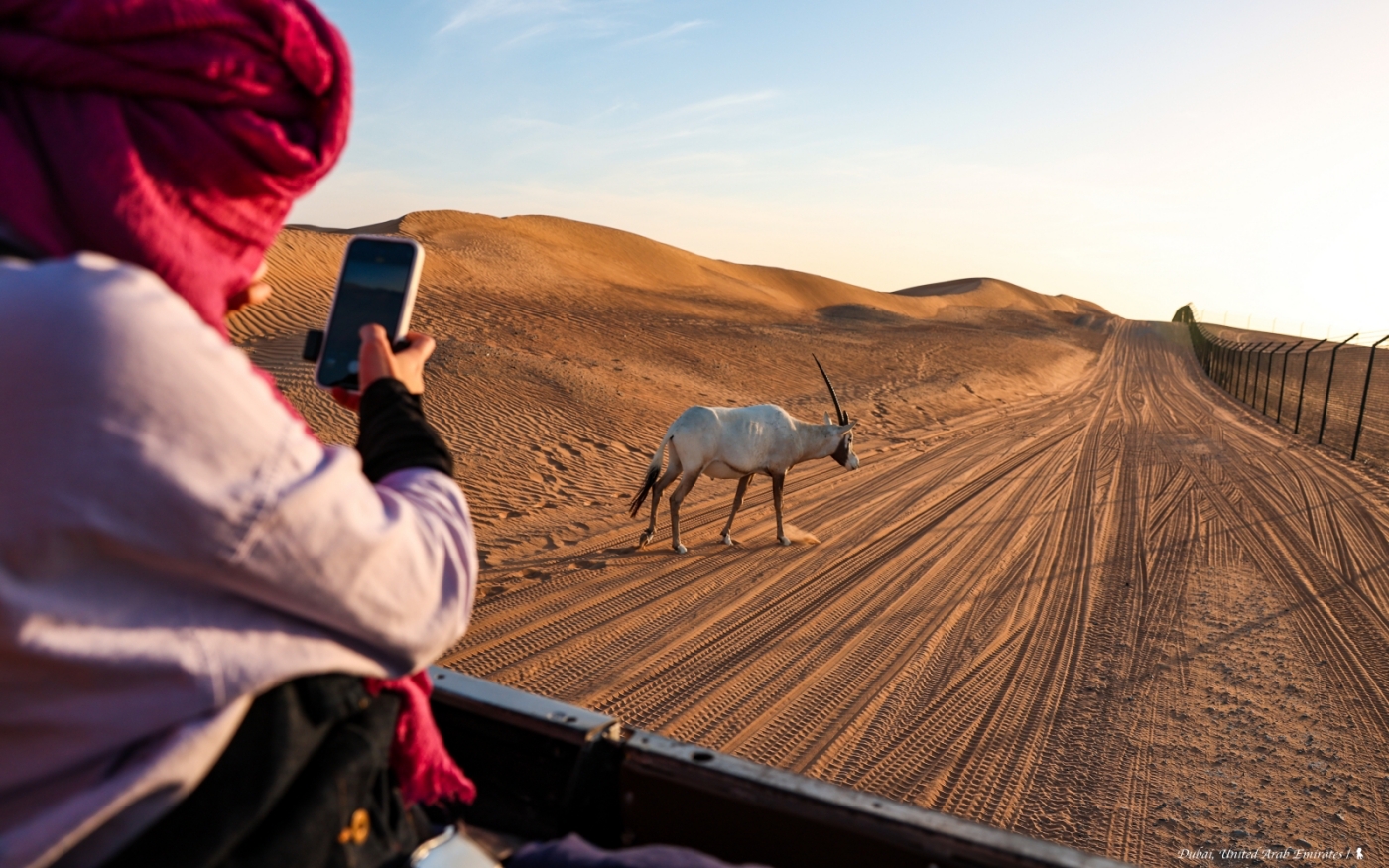 坐在拉風的越野車上橫越沙丘,速度感有,但卻少了我預期會從沙丘高處伴隨笑叫俯衝而下的橋段,後來才知道那是他們刻意的有所不為。原來,衝沙是導致嚴重荒漠化的重要原因,會導致沙漠植被和野生動物的消失,因此駕車的嚮導們只會在杜拜沙漠保護區的固定路徑上行駛,運用專業、將乘客因刺激發出的尖叫聲轉化成帶領看見豐富動植物的驚嘆聲!