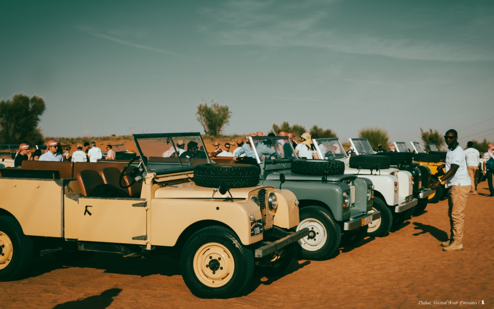 這日,從杜拜市區搭乘專車抵達沙漠,先讓我眼睛為之一亮的是一整排有資格被博物館收藏展示的 Land Rover Series 1 老爺越野車,以黃沙藍天為背景,拍照起來格外有味道,但若以為只是為了要讓遊客拍網美打卡照那就太小看他們了,這背後所著眼可是與杜拜的過去及未來有關。原來,使用的這型車款是 1950 年代引入沙漠的首批車輛,在那之前,駱駝是當地貝都因人雙腳之外的唯一交通工具,這款車無疑把杜拜帶到下個階段,因此他們特別選用、要把遊客帶回半個多世紀前重現當時的人們所見。