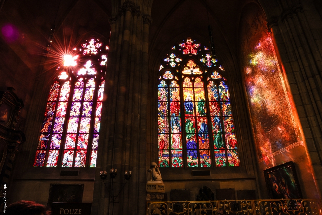 聖維特大教堂是布拉格城堡裡最知名的景點,從興建到完成歷時千年,用與時俱進形容捷克最重要的這座教堂一點都不為過,不過一旦踏進來,又讓人感覺時光在此被凍結靜止,特別是上午當陽光從右側彩繪玻璃窗穿透入內,迎光漫射,七彩斑斕從牆上到地面相融再暈開,帶來的感動不亞於曾造訪過的西班牙聖家堂,美的直教人屏息。對了,除了華美的玫瑰窗,左側有面出自慕夏之手的彩繪玻璃窗,亦值得一看。