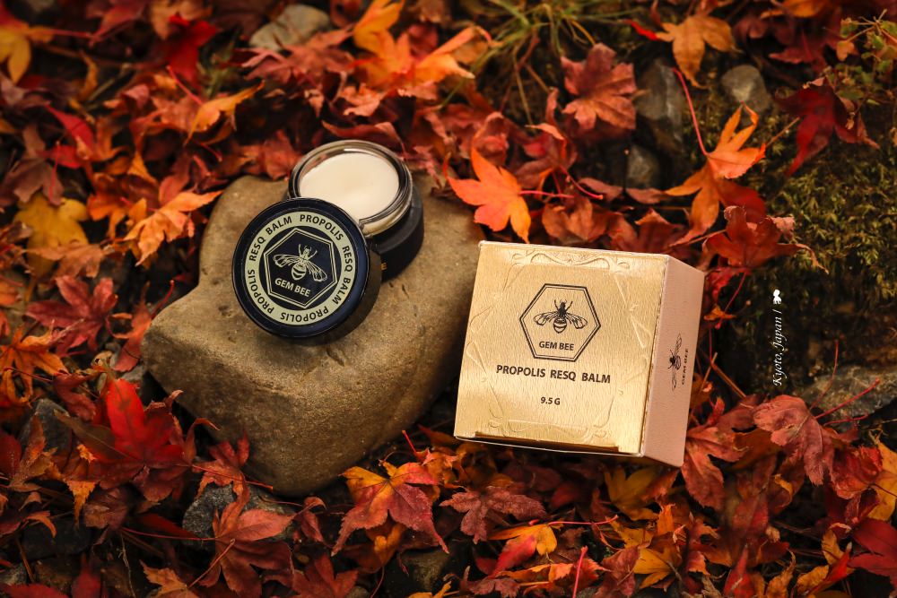 當來到京都一處賞楓名所高台寺,當時紅葉正開始掉落準備為大地鋪上紅毯,金黃陽光從側邊灑落,讓人感受秋日的富足美好,一個念頭,覺得這樣的場景跟背包裡的蜂膠百解膏似乎蠻對味,攝影師的職業病犯,我竟開始很享受著拍起了產品寫真,發現金/黑色的產品跟略枯的紅楓好搭,真是所謂的低調奢華,加上土壤、石頭與苔蘚呈現的野外感,也正好呼應產品強調的天然配方,按下一張張快門的剎那,滿足的在心底放起煙火。