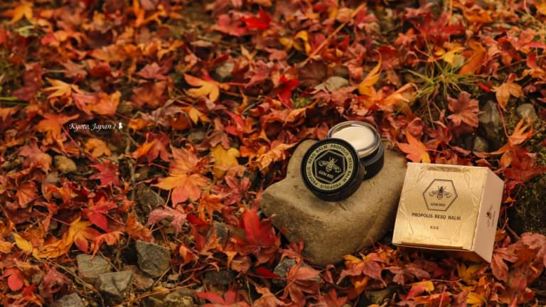 當來到京都一處賞楓名所高台寺,當時紅葉正開始掉落準備為大地鋪上紅毯,金黃陽光從側邊灑落,讓人感受秋日的富足美好,一個念頭,覺得這樣的場景跟背包裡的蜂膠百解膏似乎蠻對味,攝影師的職業病犯,我竟開始很享受著拍起了產品寫真,發現金/黑色的產品跟略枯的紅楓好搭,真是所謂的低調奢華,加上土壤、石頭與苔蘚呈現的野外感,也正好呼應產品強調的天然配方,按下一張張快門的剎那,滿足的在心底放起煙火。