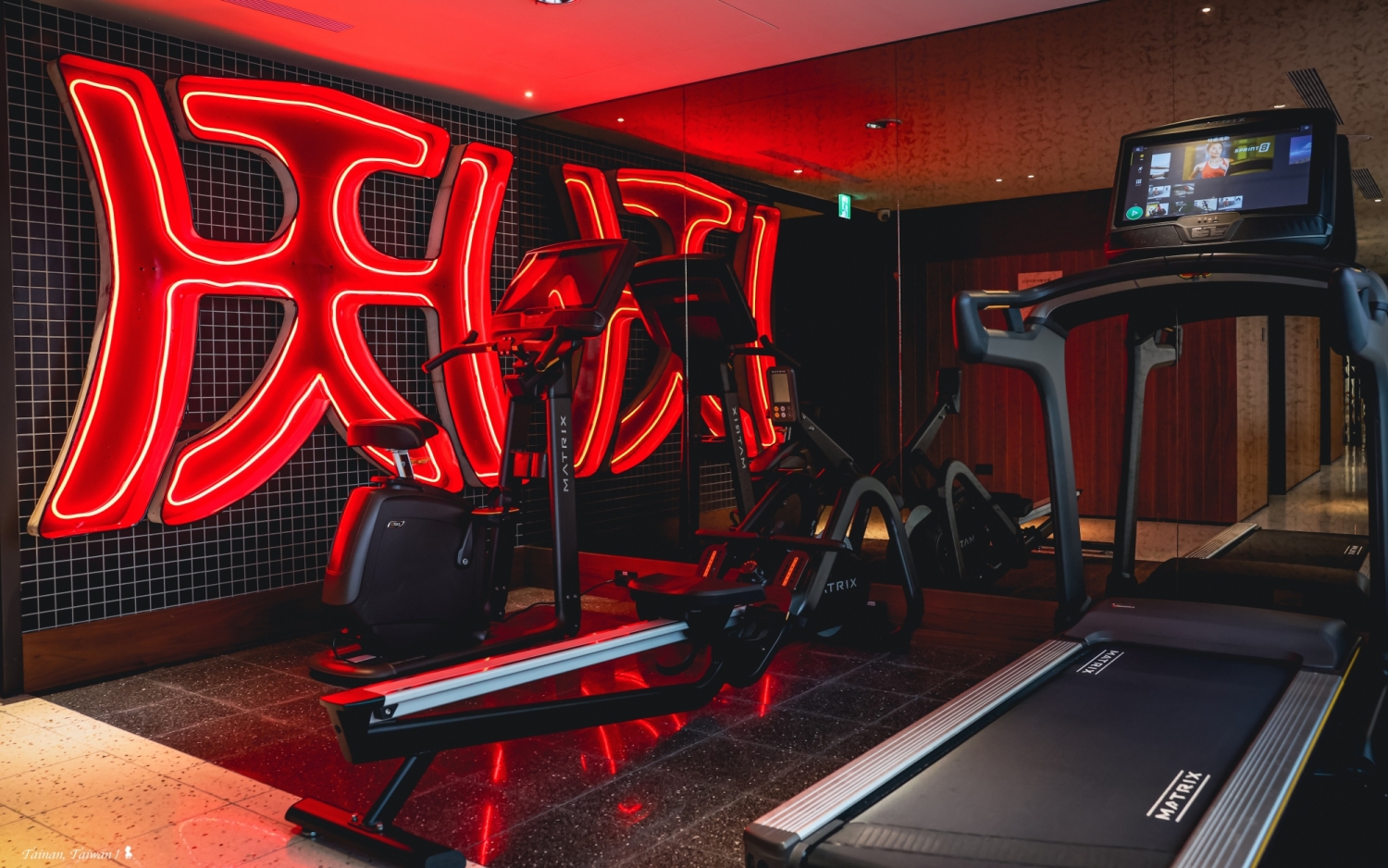 ⇑ 開放空間的健身區,旁邊霓虹燈擁有快四十年歷史,自原本飯店外牆卸下再重新使用