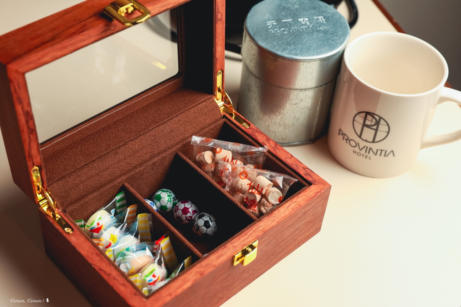 ⇑ 每間客房 mini bar 上除了訂製的傳統金屬茶罐,還有可愛的古早味零食