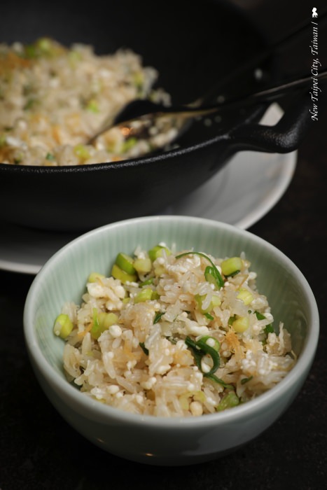 這道炒飯不是分子料理,上頭一顆顆白色的竟然是蛋白,讓我好奇想要奔向廚房直擊是怎麼炒出來!加了蘆筍與炸干貝絲,這道炒飯口味與口感兼具