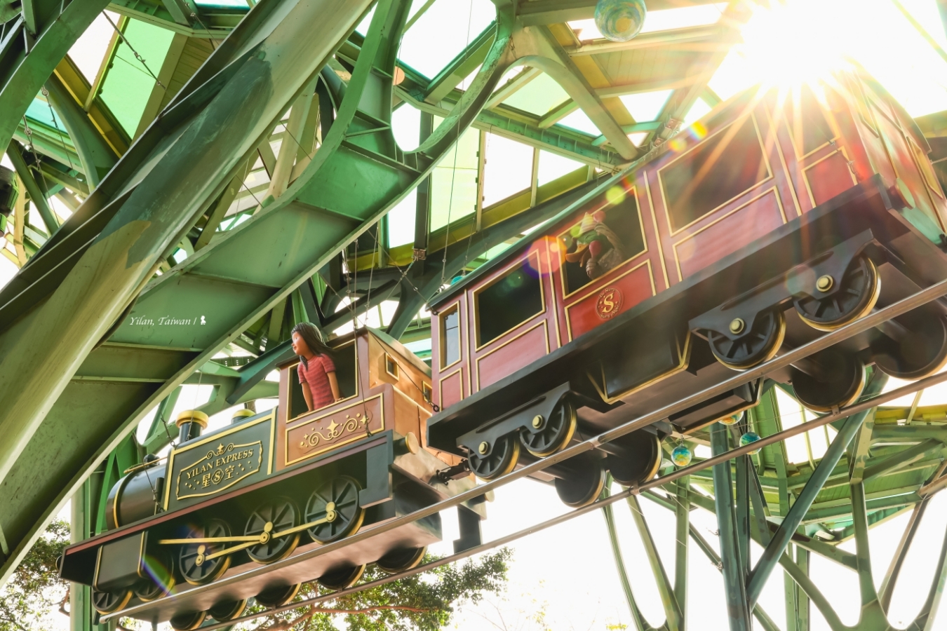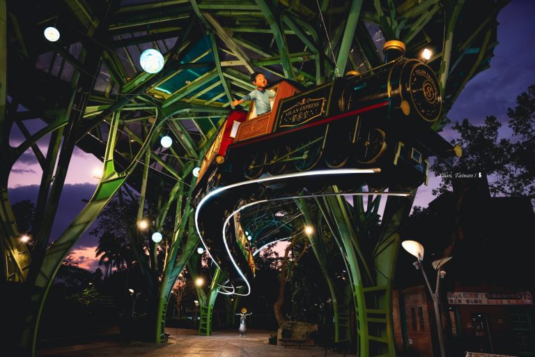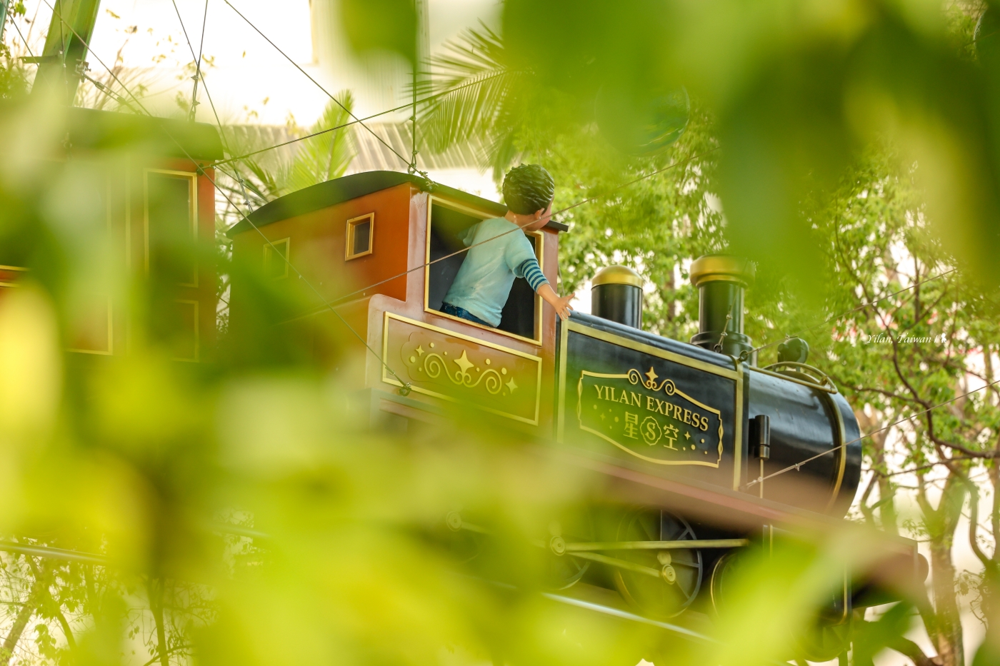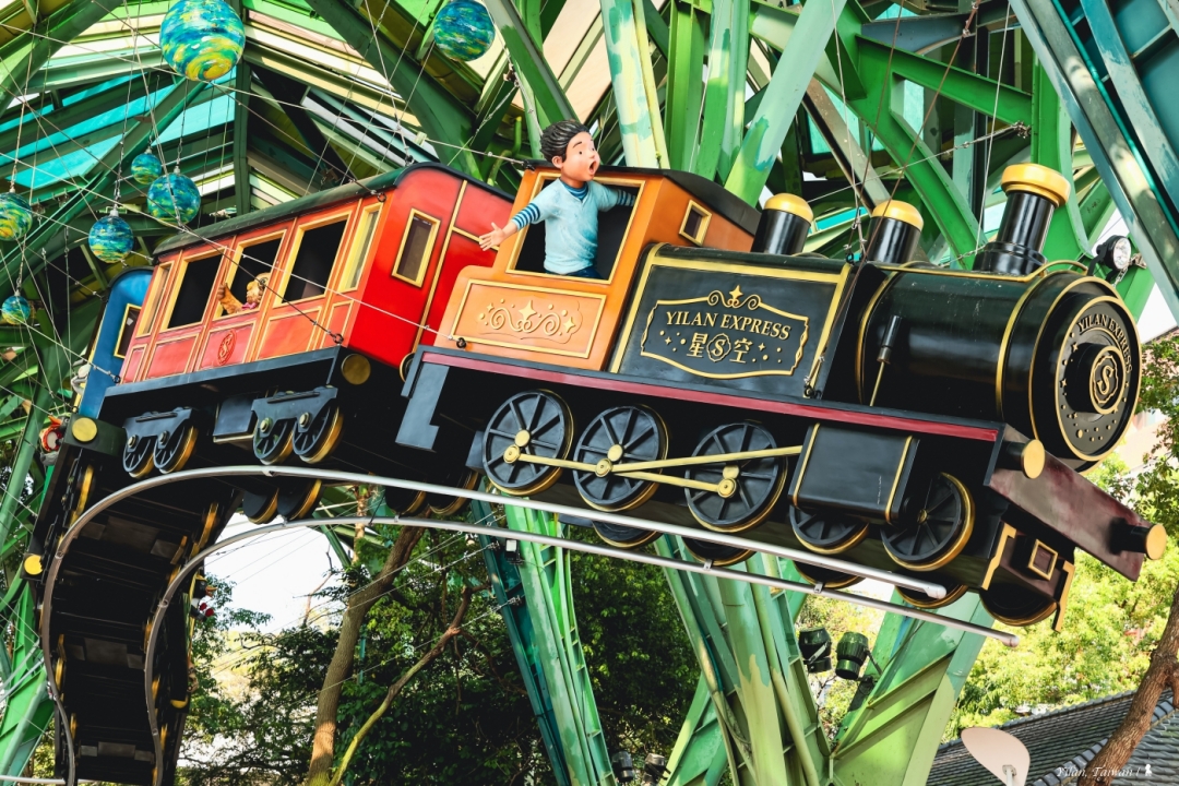 整天拍攝下來,我最喜歡是下午四點過後到日落後當天空轉為鈷藍色的這段時間,先是西斜的陽光從懸空火車尾照射過來,金黃暖好、讓列車上人物的笑容多了幸福感,而隨著夜幕低垂,不只飛天火車被照亮,火車底部的兩條流線光帶像是引路鐵軌,還同時帶來了速度感,這時不妨上腳架進行長時間曝光,還能讓幾盞燈綻放星芒,像成了無聲煙火,為這次拍攝畫上完美句點!