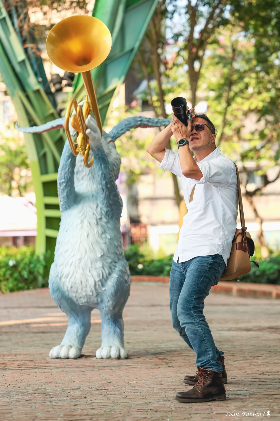 除了拍攝裝置藝術本身,若能適時捕捉遊客與作品的互動性,可增添照片的趣味性,通常這要有敏銳觀察力輔以經驗來預應人們的接下來動作,得以守株待兔並等著按下快門,大部分會在極短時間內發生與結束,這時,R3 的「眼睛偵測自動對焦」功能總能給予很大幫助,讓我可將大部分心思放在構圖與注意人的動作與表情即可,對焦的事就交給相機自動搞定,快意!