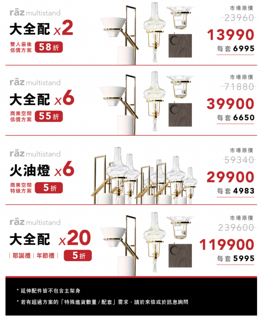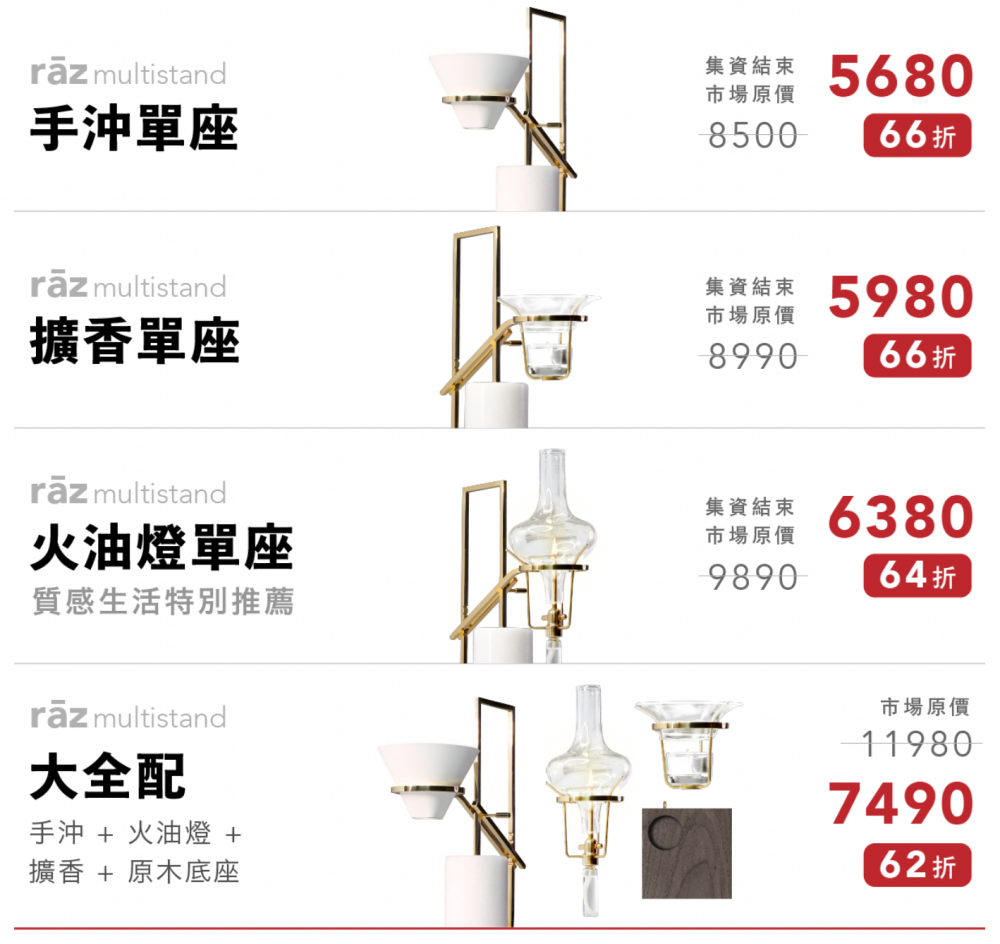 |rāz multistand |正在嘖嘖上募資只到 2022.10.31,針對需求推出各種套裝如下(轉貼自嘖嘖的募資頁面),組數有限,想輕鬆為生活創造儀式感,動作要快!若想看幾乎接近完成版的準產品,2022.10.31 前可至「OrigInn Space 大稻埕」參考實體。