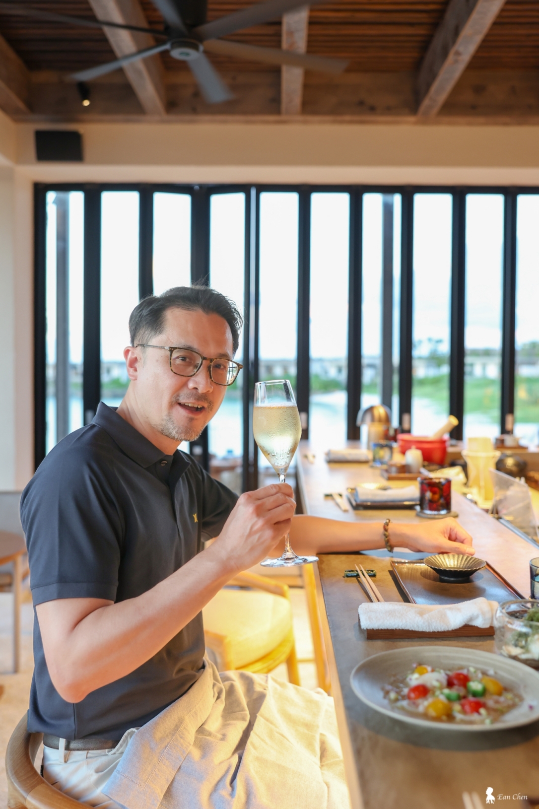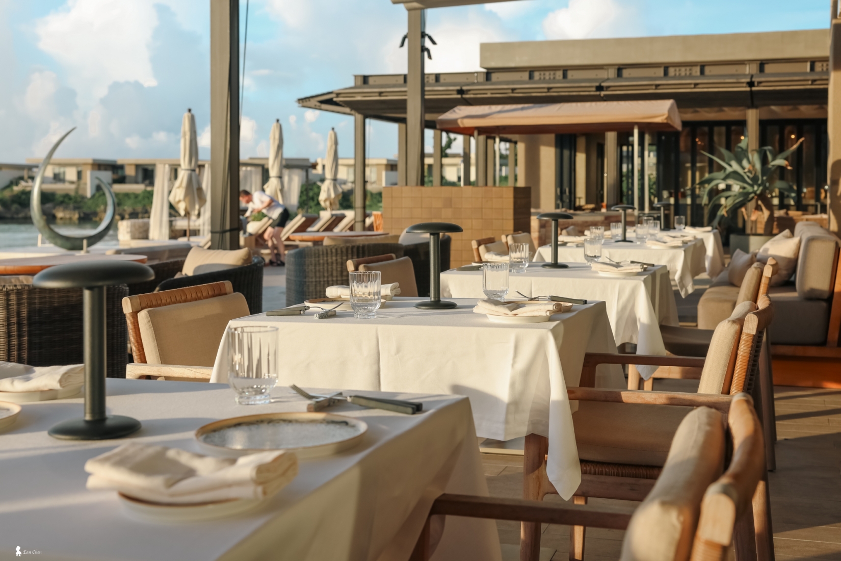 傍晚,我來到同樣面向泳池的 Nagi 用餐。Nagi 在日文裡象徵「海的靜謐」,而在這片天空下,確實能讓人感受到寧靜的力量。我選擇戶外座位,因能最直接感受夕陽時分下光線隨時間推移的變化,天空就像一幅緩慢移動的風景畫,每隔幾分鐘就會換上新的色階。