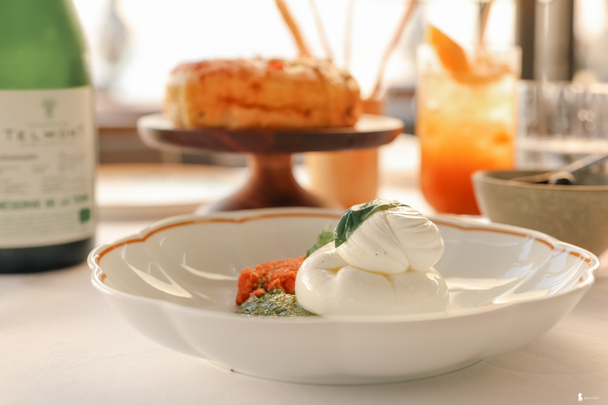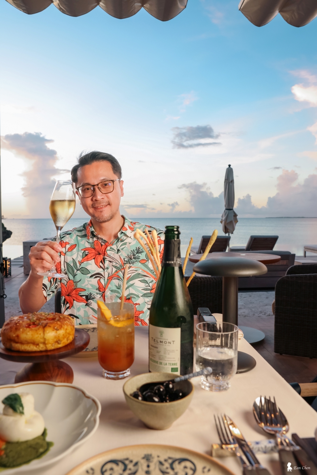 更讓人印象深刻的是服務的節奏。我選擇了夕陽最美的時段用餐,也因此難免起身拍照。愛拍照的我,不可能乖乖坐著吃完整份餐。在戶外座位與泳池邊來回走動時,我很快就發現,廚師與服務團隊會默默調整出餐時間,精準跟上我回到座位的節奏,那完全是以客為尊的細膩。餐廳經理張先生之前在東京柏悅服務,專業、沉穩,不論在餐點選擇或飲品搭配上,都十分大方分享。當晚他特別推薦一款 Telmont Champagne Réserve de la Terre—近年因李奧納多.迪卡皮歐入股而受到關注的永續香檳,氣泡細緻、風味乾淨,與義大利料理十分契合,也與那天的光線與風的節奏完美搭配了。