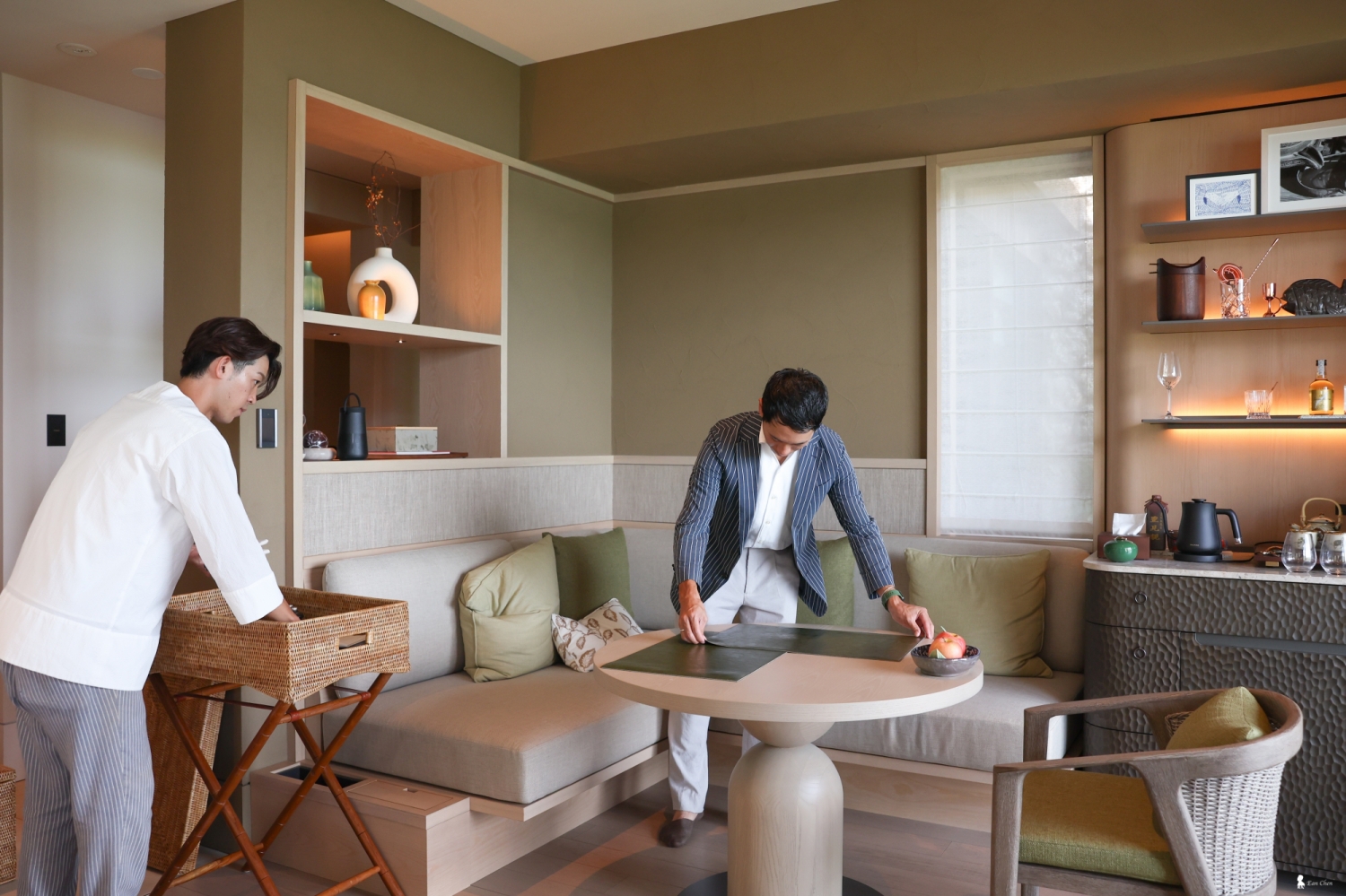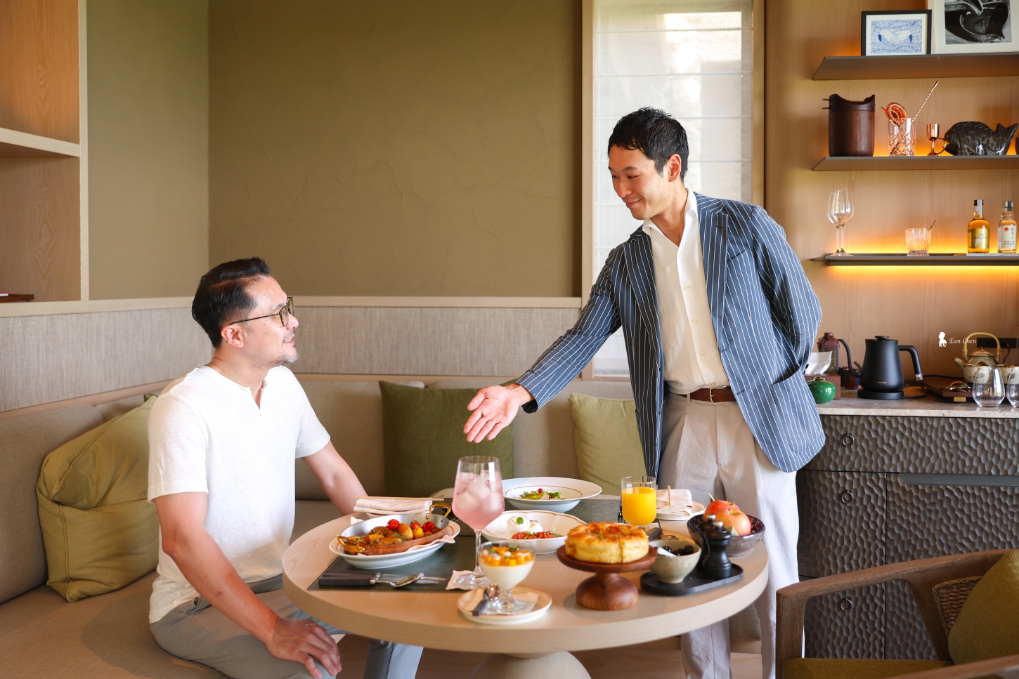 站在池畔,視野彷彿被海天一線重新校準。白日裡光影流動,海風吹皺水面;當人走近邊界時,那片藍又會收斂成一條乾淨的地平線。那種視角會讓人忍不住想直接走進水裡,想像一個撥水就能直接游進大海裡。也因為這樣的景觀張力,泳池成了度假村兩間餐廳的重要舞台,不論是午后的 YUKUU 或傍晚的 Nagi,許多用餐時刻都以這片藍作為背景,自然而然成為旅程記憶的主色調。