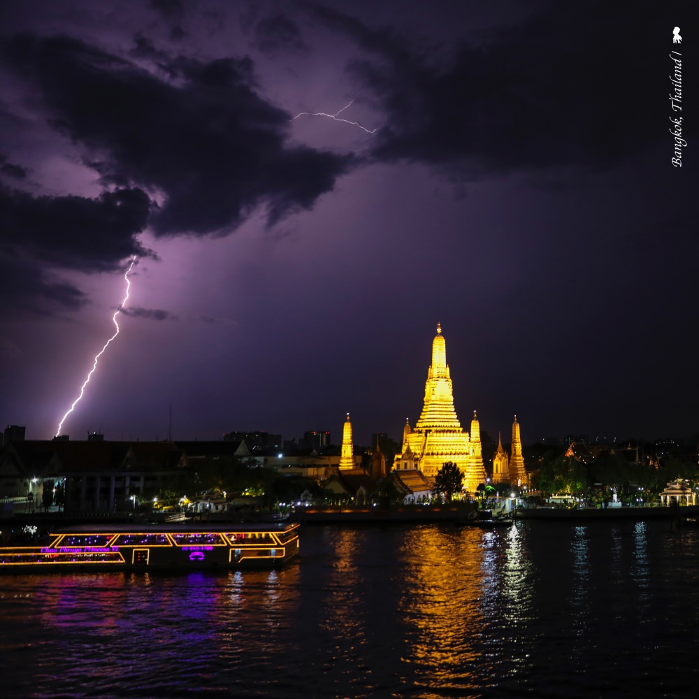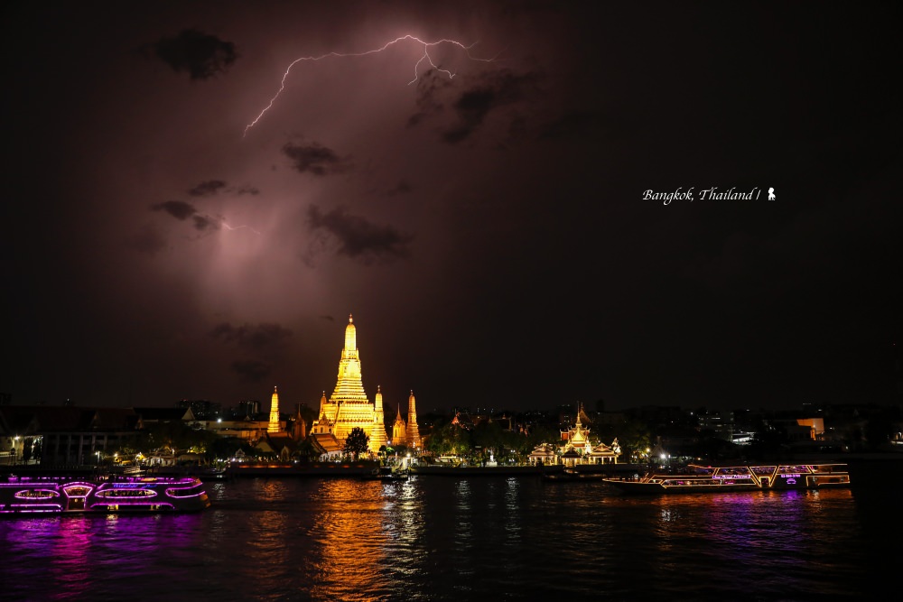 這晚曼谷天有異象,一場閃電大秀在酒吧面向的昭披耶河與鄭王爺廟上空持續了快個把鐘頭,大大小小閃電有紫、有橘或一瞬間點亮成了白晝,彷彿開天闢地來到了創世紀。正好相機在手,就完成了我生平第一次的閃電拍攝,實在過癮!