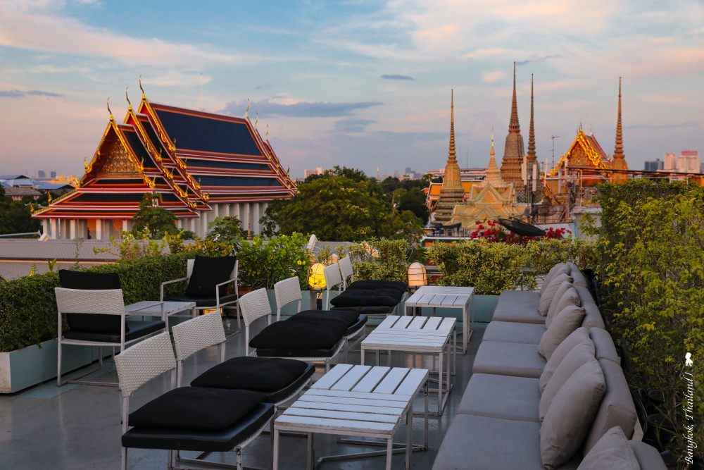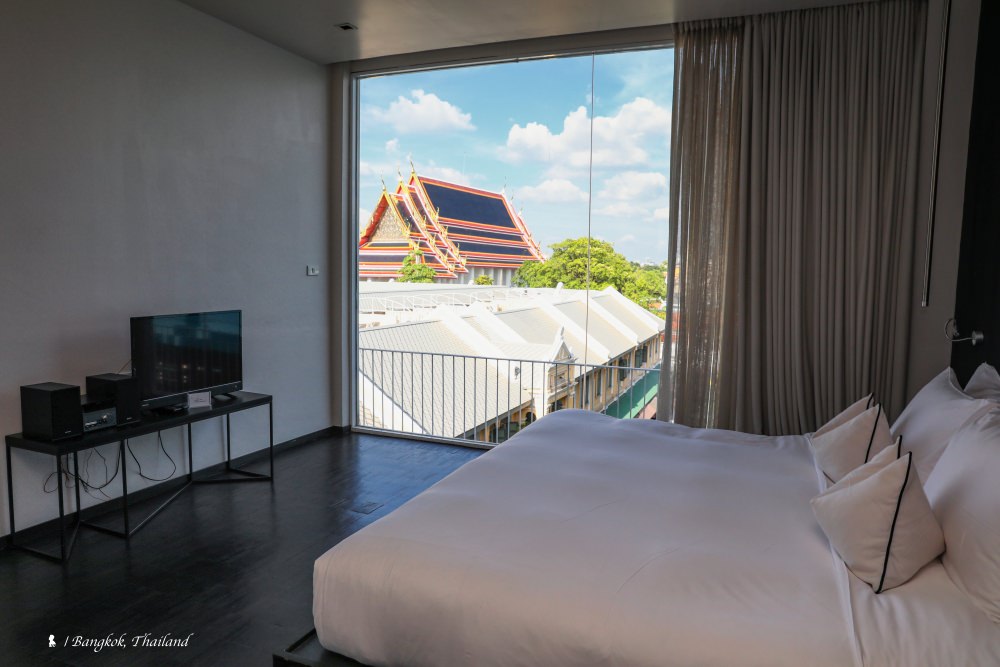 改建自兩棟老公寓的 Sala rattanakosin Bangkok 設計酒店,只有 15 個房間,房間數少,但房間可不小,沒有電梯,但貼心的飯店員工會幫忙搬運行李。旅館設計出自 Onion 工作室之手,Sala 旗下的多家精品酒店設計也都交給他們,風格偏向現代融合工業風,相較於公共空間、房間設計更為簡潔俐落,我想,可能是要讓客人把注意力留給大面落地窗外的景觀,畢竟,這可是該酒店的最大賣點!