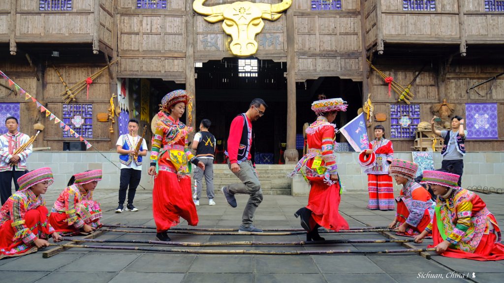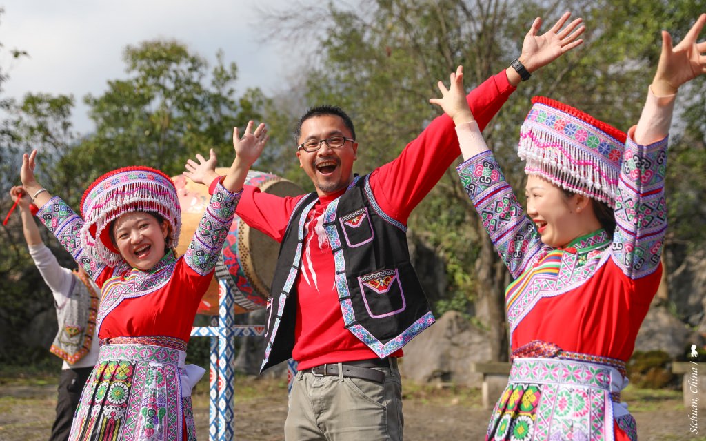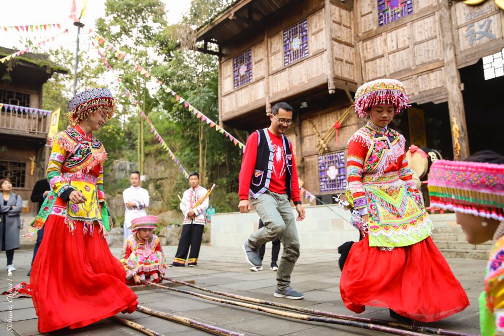 興文縣是四川最大的苗族聚集地,除了擁有令人眼界大開的幻奇地貌,來到石海景區,還能嚐鮮感受苗族采風。入境隨俗、我穿上傳統服飾,在苗族姑娘的帶領下,我默背著她們教我的口訣,來挑戰苗族特色的竹竿舞。此外,以一株變黃的銀杏樹為中心,一群花漾少女們領著遠道而來的我們圍成圈,前進、後退、拍手、轉圈,突然風一陣,鮮黃的銀杏葉彷彿也忍不住隨我們的節奏跟著舞動,在蔚藍晴空下離枝飛舞並旋轉降落,我拾起一片秋色的銀杏葉,指向了天,衷心感謝這份見證海枯石爛的緣分。