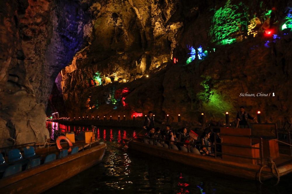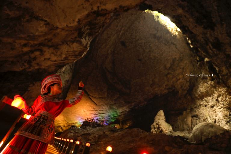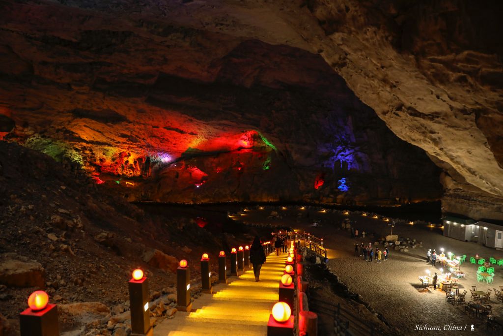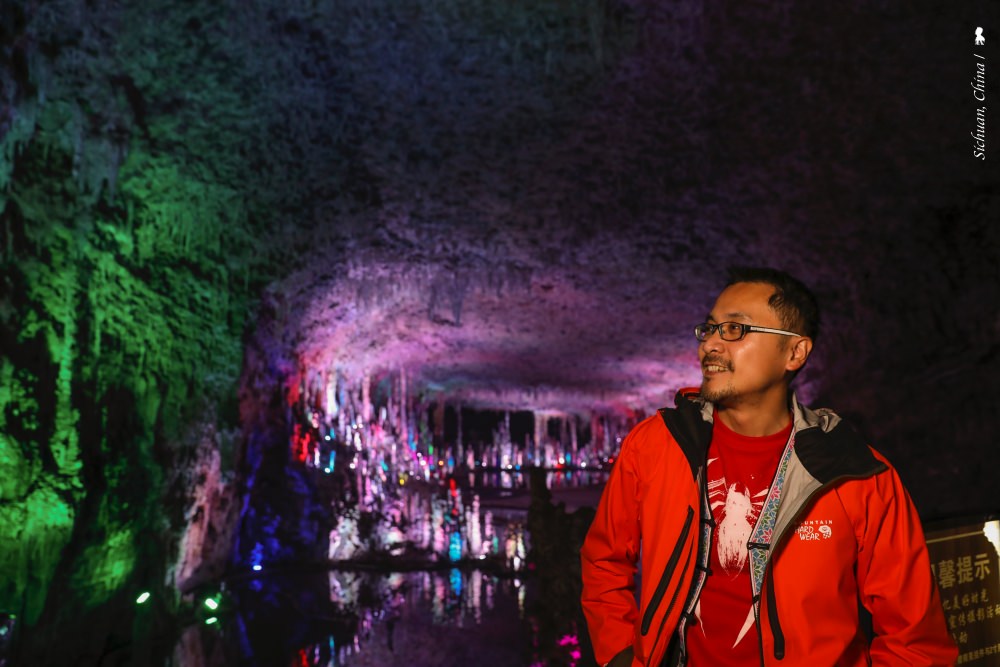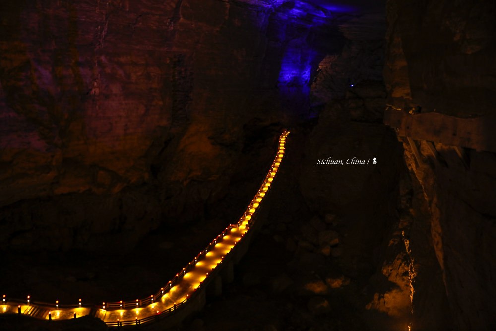 歷史超過 300 萬年的天泉洞,是本趟四川行最讓我驚豔的景點,可滿足人們渴望在地心探險的夢想。天泉洞目前探測長度為 10.5 公里,上下共分四層,就空間規模與遊覽長度,據說均居世界洞穴之首!從洞口陡峭的蜿蜒而下、直向地心而去,因未知帶來了高度的興奮感!其中一段,抬頭看數十公尺高有個地表裂縫,成了天窗,光從那流瀉而下,直下鋪展開來的階梯兩旁紅色微暗的燈一盞盞,彷彿讓千古密室宮殿重見光明。