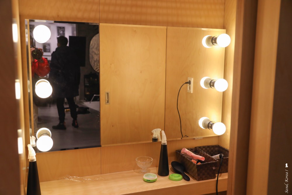 拍攝的攝影棚是位於 AK PLAZA 的富士照相館(Fuji Film: The Studio),這座位於弘大的 AK PLAZA 是 2018 年 8 月才開幕的購物商場,攝影棚自然也相當新穎,有別於一般在台灣常去拍攝的傳統相館。這裡有個像是劇院後台的梳化間,有髮膠等備品提供使用,正式拍攝前可在這稍作整理。