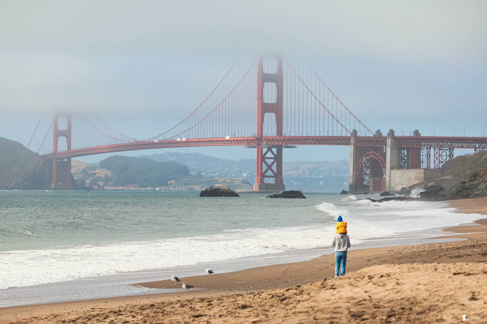 ⇑ 在海浪聲與海鷗鳴中,鏡頭追隨父子背影,走向被雲霧輕掩的金門大橋,記錄下舊金山午後的溫暖片刻