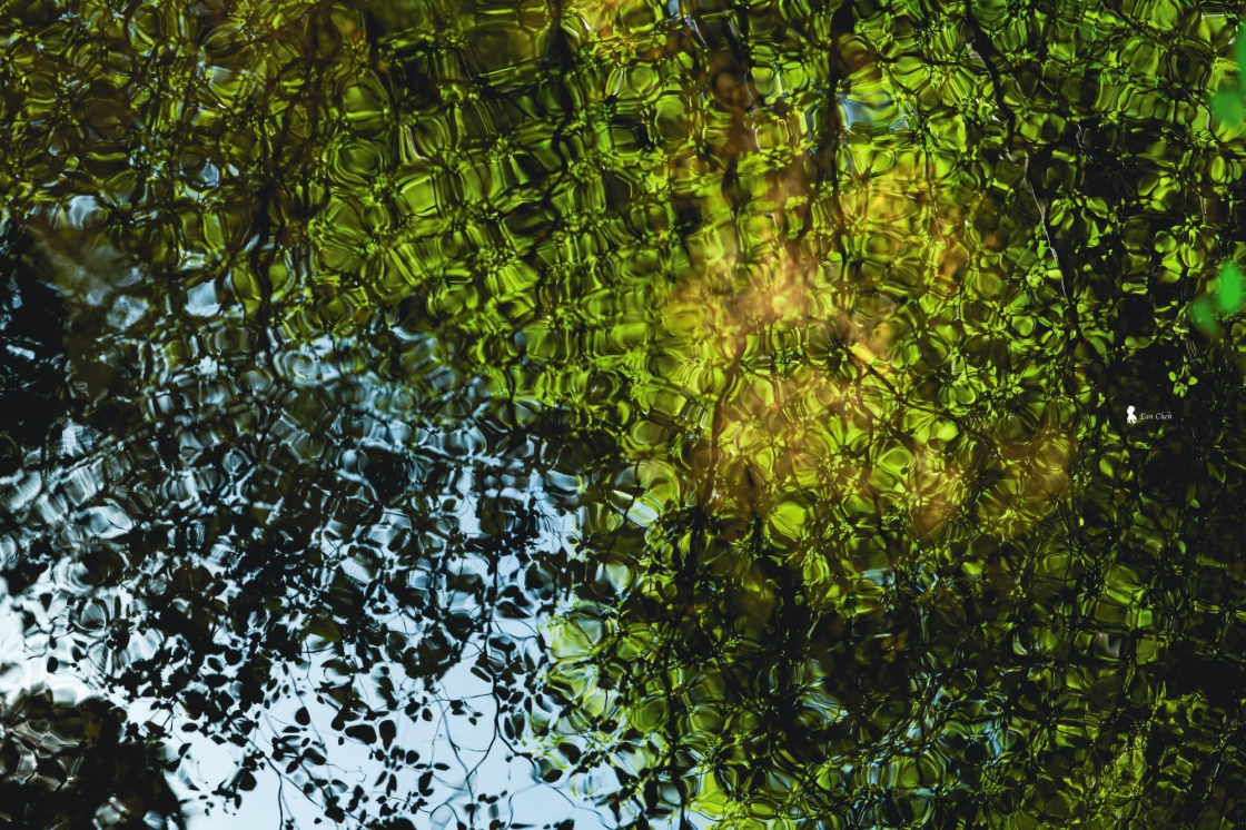 ⇑ 微風輕拂,水面像畫布般碎裂、重組,把森林的綠意化作抽象油彩