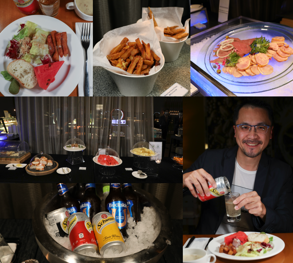 下榻國際五星級飯店行政樓層,都會期待專屬禮遇、特別是傍晚的 Happy Hour。有些遺憾的是,新竹喜來登 22 樓的行政酒廊因疫情關係暫停開放,聽也常住飯店的朋友說他們的行政酒廊給的大方,可惜這回我沒能遇上。不過,入住行政樓層的客人還是有福利,改在一樓大廳酒吧提供,每晚 6:30-8:30 的 Happy Hour,除了各式酒類與軟性飲料,還有沙拉、麵包、水果,熱食這晚則是炸喜相逢與甘梅薯條,沒誇張到能當成晚餐解決的小型 buffet,不過吃吃喝喝還是蠻開心的。