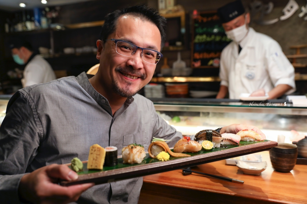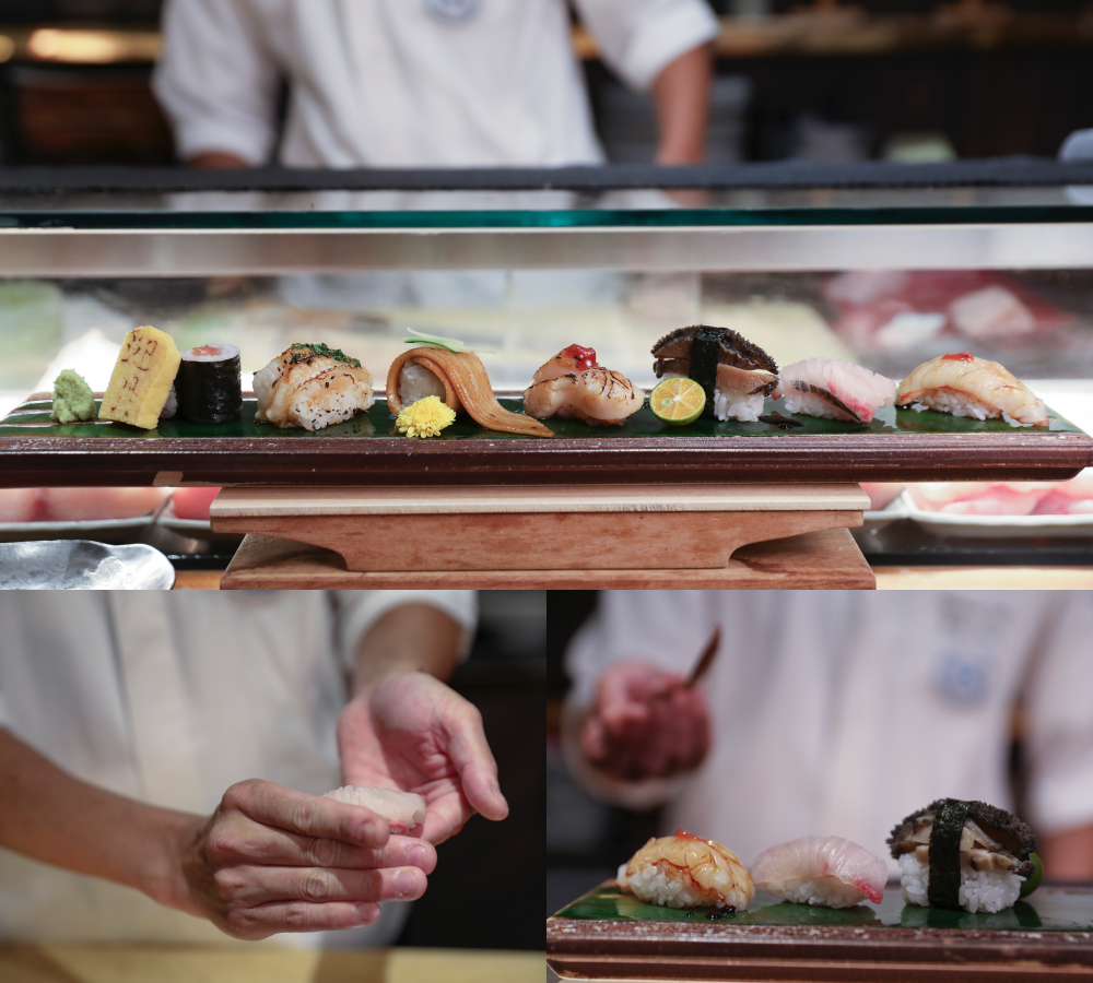 這天我吃的套餐主菜「特選上乘握壽司」很具水準,尤其是欣賞著主廚在我面前一個個用神之手快速捏握成形,南非鮑魚、大干貝、日本特有魚分別覆蓋上頭,像個饕客的珠寶盒,主廚建議由右至左依據口味淡至濃郁食用,於是,接連著,在口腔放起煙火。