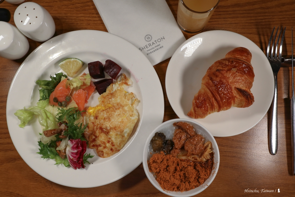 住飯店,總有個讓人不想賴床的念想,就是早餐。新竹喜來登早餐安排於 2F 的盛宴自助餐廳享用,規模屬大型自助餐,非常豐盛,可說該有的都有了,師傅現煎歐姆蛋、現煮麵食,還有讓客人自己現沖的美國霜降牛肉湯,我愛吃的稀飯也有,粥煮得好,可惜配菜少了些。這的早餐讓我最印象深刻,是每天都要花些時間送進烤箱烤一下的可頌,層次分明、外酥內軟,是有水準,若來住新竹喜來登推薦不要錯過。