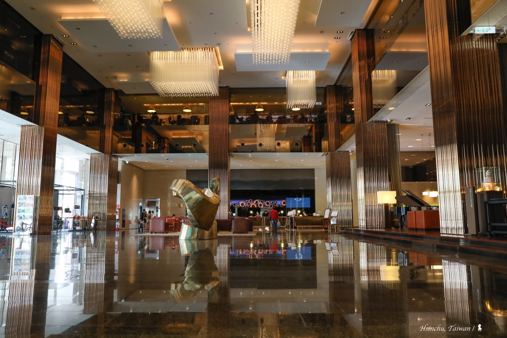 首次踏進 12.5 公尺超挑高的新竹喜來登大廳,我有被飯店氣勢震懾到,多達 770 間房間,僅次台北君悅為全台第二多,讓我意外。不過想想有此規模也是合理,因離竹科不過十來分鐘加上喜來登隸屬萬豪國際集團,除具一定品質也能享受點數累積回饋,自然能獲得國外商務客青睞。仔細觀察,當初新竹喜來登在空間設計上,使用的在地語彙,除有不讓人意外的新竹客家文化,更加扣緊竹科代表的科技意象,負責操刀的國際設計集團 Wilson 室內設計所把主機板、電纜銅線與另一項新竹代表性的玻璃工藝相結合,於是大廳天花板上多組吸頂的柱狀玻璃燈具表現的是主機板,此外接待處的 12 公尺 LED 牆面及另一側的 LED 光廊樓梯,也都充滿科技風。