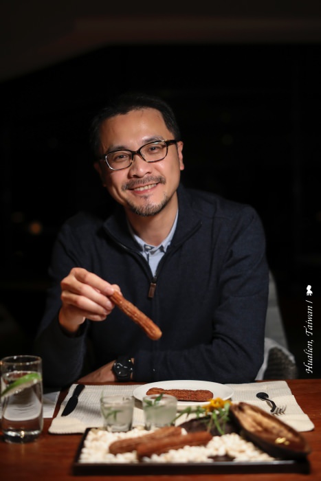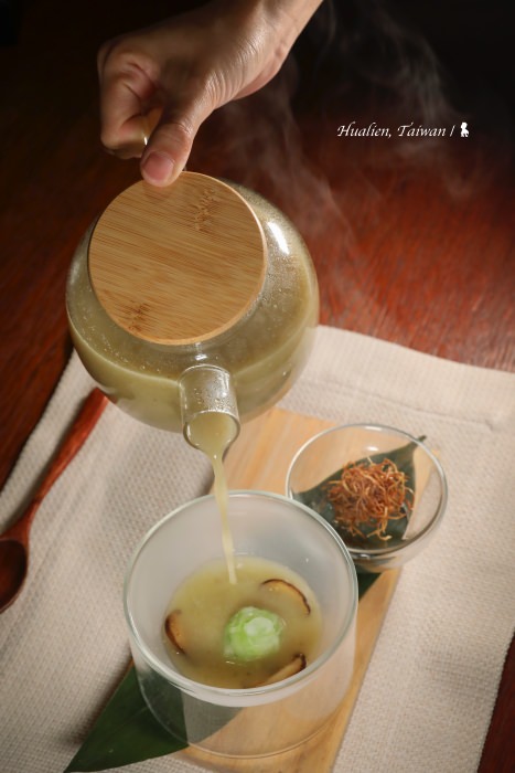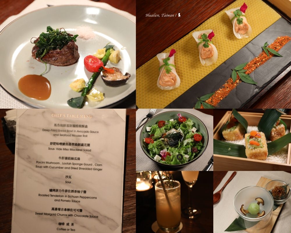 晚餐在交誼廳享用的主廚餐桌,以在地食材但又玩出美味的新花樣,讓我留下非常深刻的印象!其中「牛肝菌菇絲瓜湯」,主廚將花蓮吉安大黃瓜刨絲搭配香菇乾放入碗中,將選用壽豐黃金蜆、絲瓜以及牛肝箘熬煮成的高湯,採桌邊服務倒入碗中,一旁的酥炸薑絲視個人口味放入,鮮甜湯頭加上了薑,在微寒春夜暖了胃,等等,這湯喝起來怎有些熟悉?原來,是絲瓜蛤蠣湯給主廚的靈感,但讓人佩服的是,不僅多了口感層次、結合在地故事,更是把用餐體驗提升到另一境界!同樣結合在地的創意概念,也把很有原住民風味的馬告與鮭魚慕斯搭配,而主餐爐烤菲力牛排,使用酥炸刺莧增加香氣與口感,同時選用在地小農的蔬菜做配菜,甜點部分,更是把飯店香草花園種植的萬壽菊剁碎加入麵糊,以高溫油炸成口感酥脆的吉拿棒,沾的可可醬甚至還用了小米酒來提味。