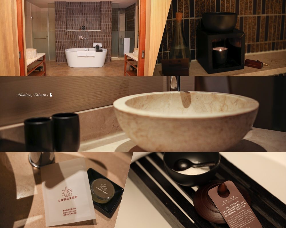 ⇑ 很棒的浴室空間,右上角的精油薰香、右下角的沐浴鹽,可讓客人有個完美的沐浴時光!此外還提供攜行袋方便把香皂帶回去