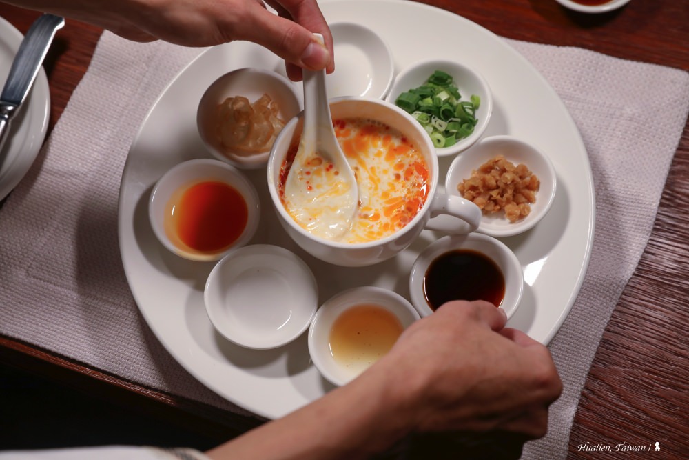 頂級住宿不能少了美食,太魯閣晶英從早餐、行政酒廊下午茶到晚上的主廚餐桌,一再驚艷我的味蕾。入住行館樓層的客人,可選擇到自助餐廳或清幽的交誼廳享用套餐式早點,我選擇後者。套餐有中西式可選,雖然西式麵包相當好吃,但若只能擇一,我個人還是推薦中式。其中光是前菜的鹹豆漿,就好精彩!在廚師的帶領下,依序加入醋、鵪鶉蛋、蔥花等佐料,食材間產生的化學變化,讓我驚嘆。主餐的九宮格稀飯沒讓我失望,加了紅藜的清粥,多了健康但保持住稀飯的黏稠,九宮格配菜賞心悅目,光肉鬆就足以讓我嗑完稀飯。