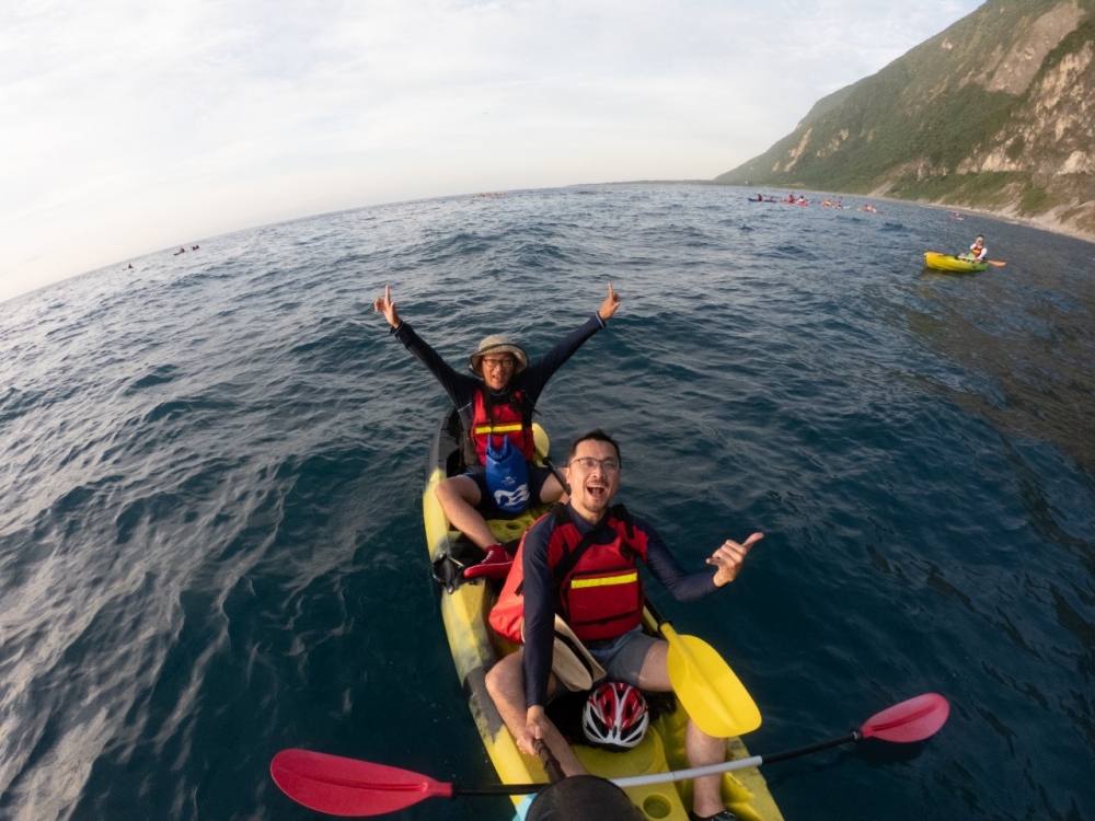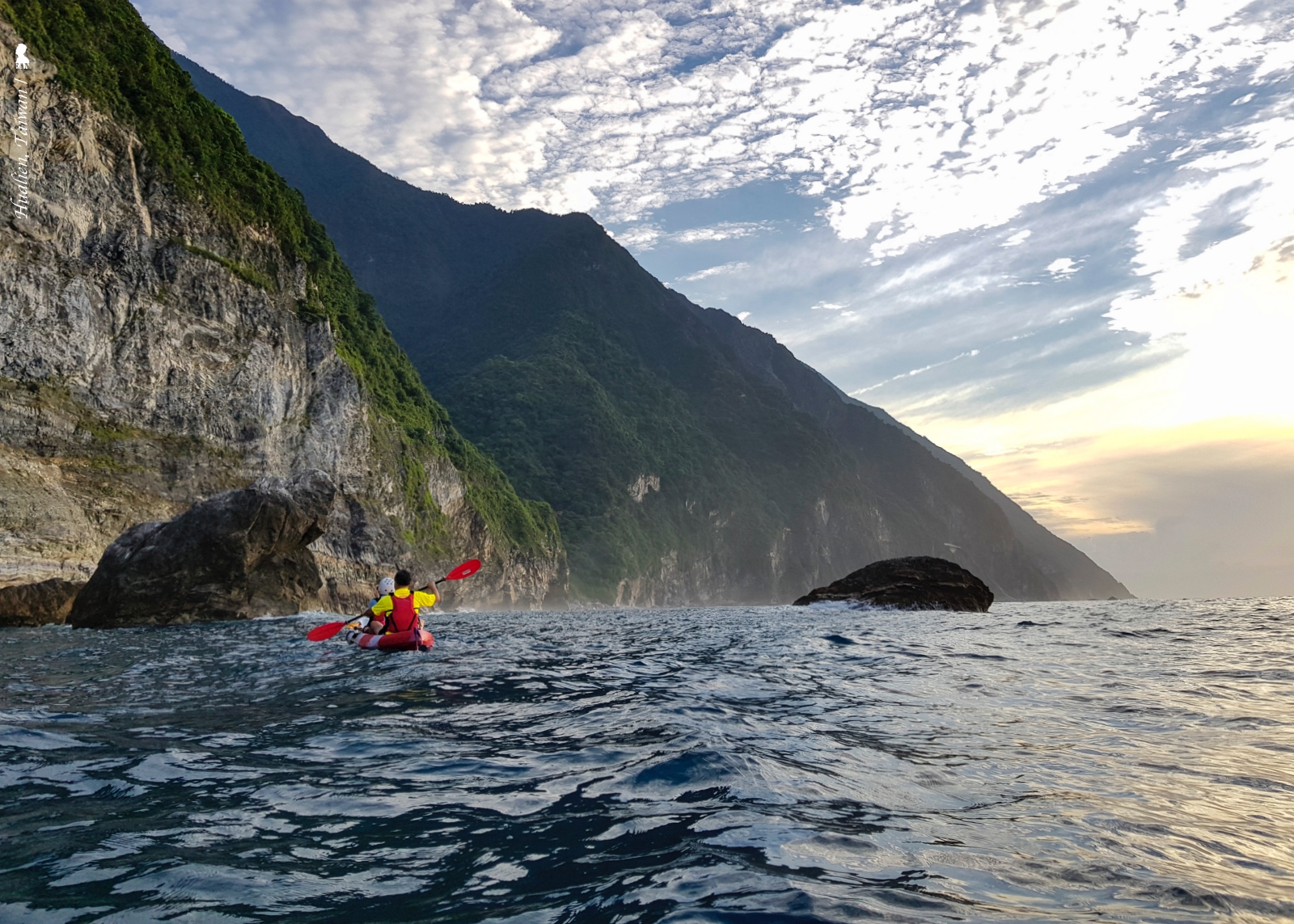 聽完表演,趕緊回房休息,隔天凌晨準備摸黑起床。2 點半 Morning Call、3 點準時出發,為的就是解鎖清水斷崖日出海上獨木舟。經過換裝、教練講解操作要領,手拿槳踏上崇德海灘,破曉前已集結黑壓壓的大批遊客,我跟同行夥伴開玩笑說那氣氛宛如搶灘,有種大時代的緊張氣氛!確實會有些緊張,有別於之前在平靜水域玩獨木舟,光是要抓浪退時機推舟出航,就得全神貫注,一不小心就要重新來過。海上獨木舟絕不輕鬆,若是抱持浪漫幻想前來,我勸你打消念頭,但身為台灣人,這的確有資格被列為一生必定要體驗一次的活動,居住在四面環海的島嶼,很少有機會從海上看拔地而起的高山峻嶺,會感動!無怪乎米其林指南會將清水斷崖評定是三星景點,著實壯觀!為了慶祝這難得一刻,我事先泡了上好的武夷山肉桂岩茶,在獨木舟上品飲,敬太平洋日出及集結所有美好因緣的這趟旅程!