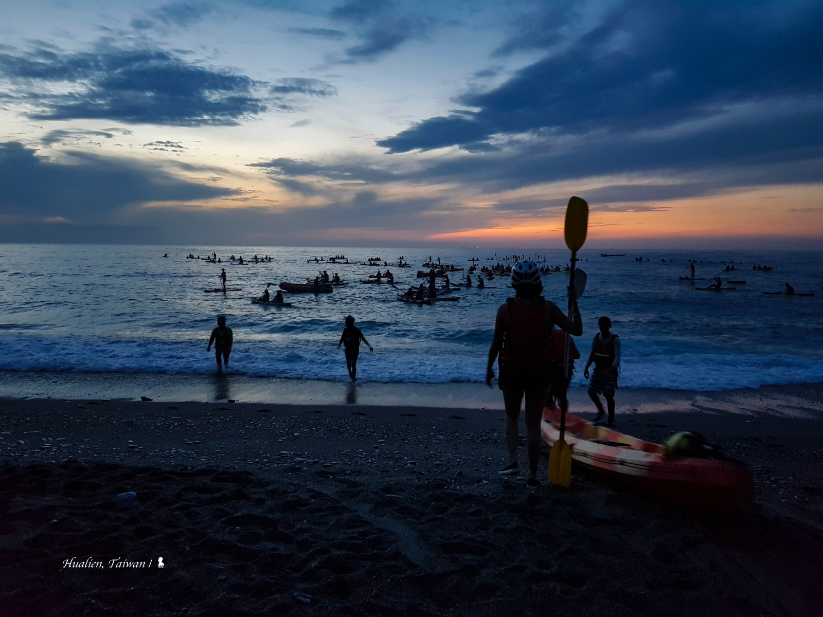 ⇑ 日出前的崇德海灘,海面上已佈滿划舟人潮