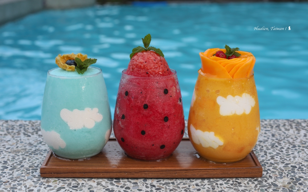 回到飯店,關於夏日慶典,驚喜還沒完!太魯閣晶英正推出了夏日限定冰品,有會讓少女心爆發的可愛系也有大人味。帶有禪風的是,以太魯閣壯闊峽谷為設計的太魯閣山之冰,以焙茶剉冰搭配紫心薯冰淇淋、焙茶奶凍與手工洛神花粉圓製成,清香中帶點酸甜滋味。另推出三款冰沙是黃金芒果雲朵冰沙、藍天白雲酒釀雲朵冰沙以及盛夏西瓜冰沙,造型可愛加上顏色繽紛,在泳池邊拿著拍一張,就是最消暑的網美打卡照。