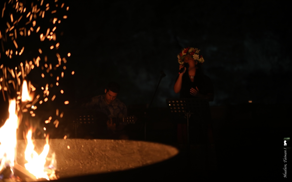 隔三個月再來,交誼廳善用料理說在地故事的晚餐,一樣精彩!交誼廳外的火盆區,晚上八點半準時上演彈唱表演,據說約有五組團體輪流、每日不同。就那麼巧,這晚跟三月欣賞到的表演團體竟是同一組:Nina & John 。排灣族女孩與來自夏威夷的夫婿,婦唱夫隨,我用「峽谷的天籟」來形容這美好的組合。三月那次來,我拍了幾張他們表演的照片因而相互圈粉,後來持續在社群媒體上彼此關注,沒想到再回來太魯閣還能遇見,我就說這峽谷肯定是有某種巨大能量呀!