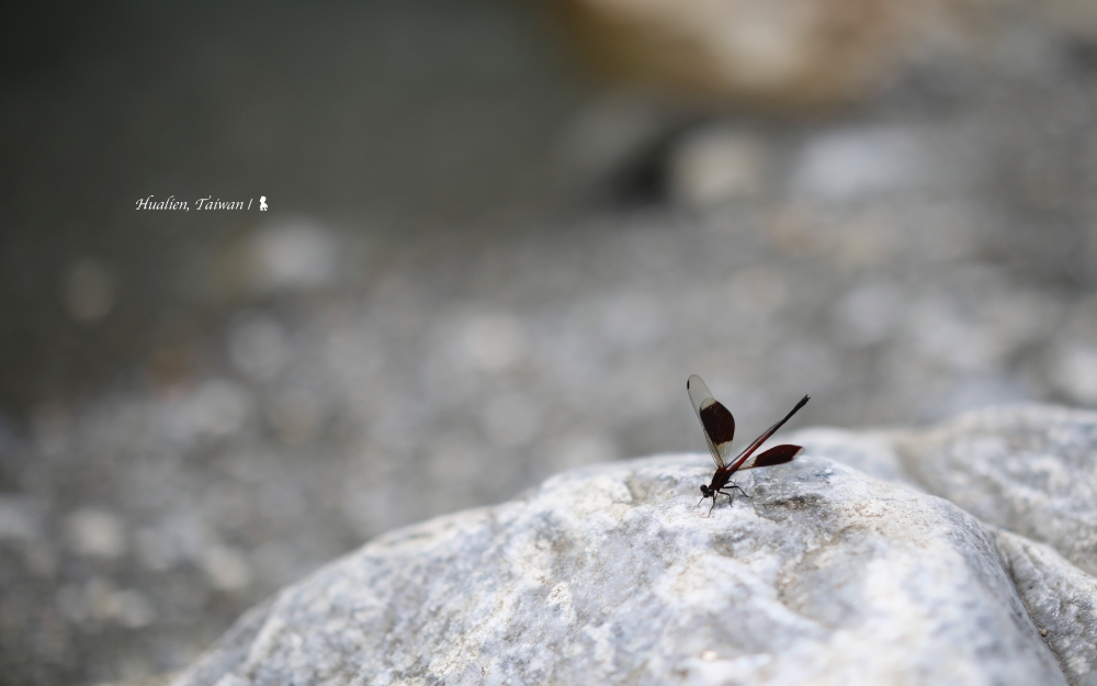 還有幾位夥伴被來時路美景耽擱未至,趁著空檔,我忍不住再往前探索,路勢與水邊趨近,更能欣賞清澈翠綠的溪水之美。我突然看見一隻豆娘,停駐溪畔的雪白大理石上,但無奈此刻相機上的鏡頭是 Zeiss Milvus 50mm f1.4,那是顆手動對焦的定焦鏡來著,尤其開著大光圈、想要用手動對焦鏡成功捕抓到行動中的物體,非常不簡單,我趕緊放慢動作一邊蹲下,等不及確認是否百分百準焦只管搶拍。就在按下快門的瞬間,豆娘忽然倏地拍打一下翅膀,我欣喜的檢查相機螢幕,不僅準焦還拍攝到翅膀伸展的畫面,那是個大自然賜予的無價禮物,想領取,靠的是機緣。