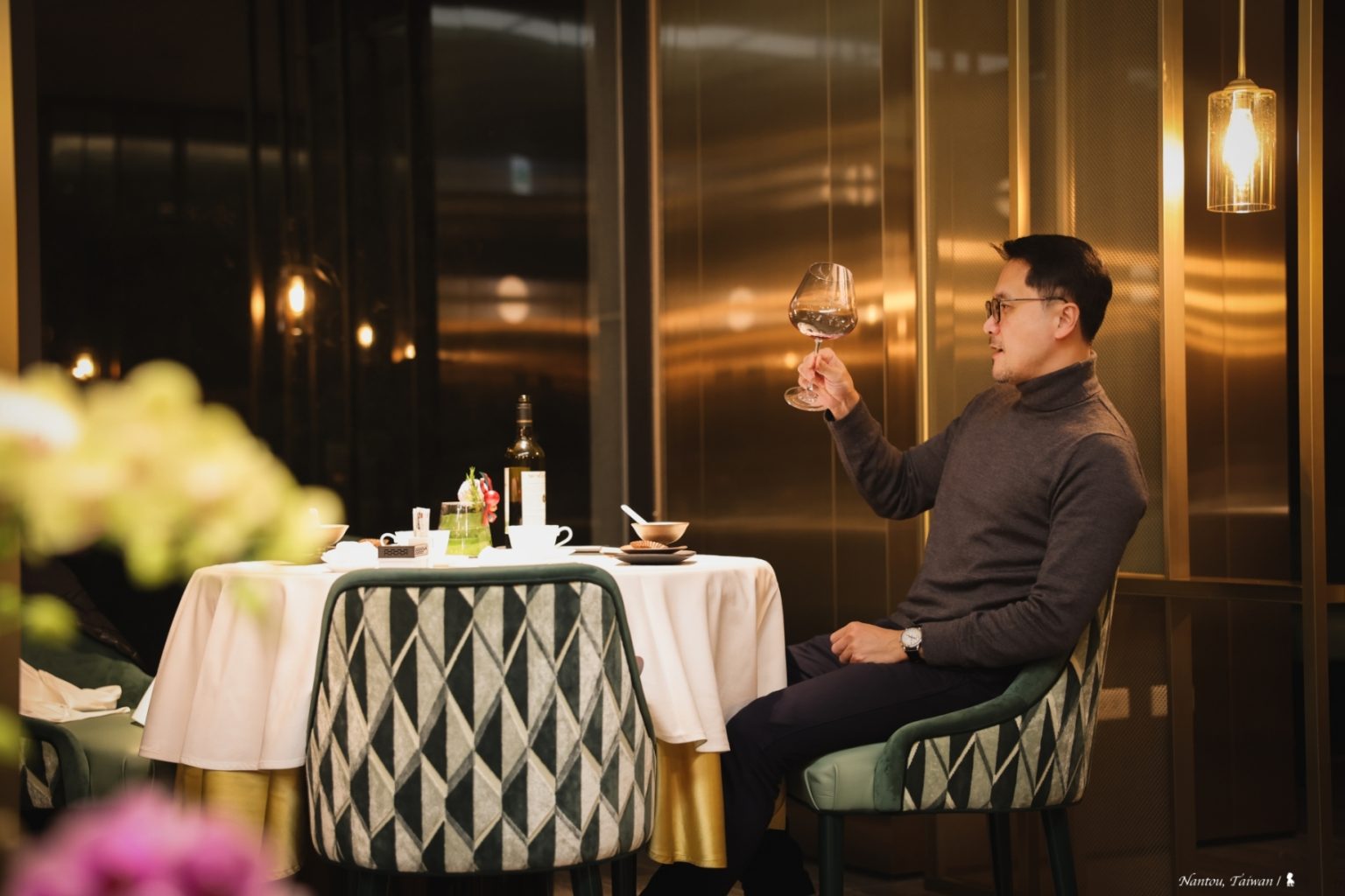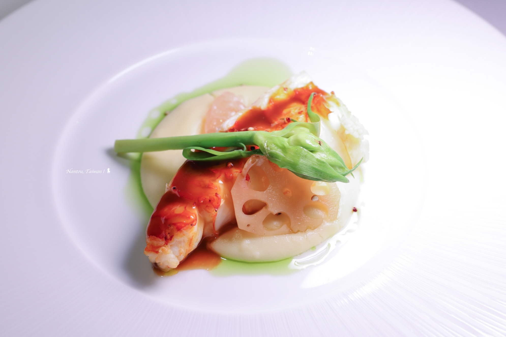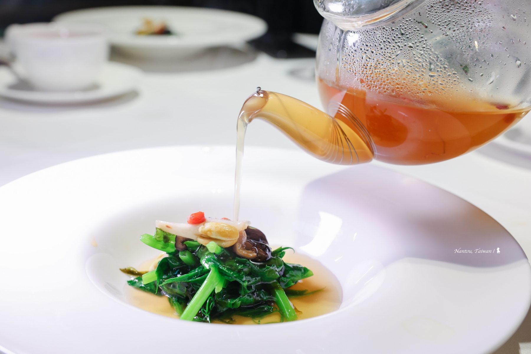 「日月軒」主打運用台灣在地食材詮釋經典粵菜,以個人套餐方式呈現。套餐內含南非鮑魚、澳洲水姑娘龍蝦等珍饈,選材講究且新鮮。湯品「馬告青橄欖燉鮑魚」讓人印象深刻,湯頭清甜且帶有馬告與檸檬的細膩香氣,為整餐開啟完美序章。還有一道「花生芽埔里香菇菜苗」,桌邊服務倒入的高湯,加入了人蔘、枸杞葉,搭配鮮嫩菜苗可說相得益彰。最後甜點楊枝甘露則是畫上美好句點。