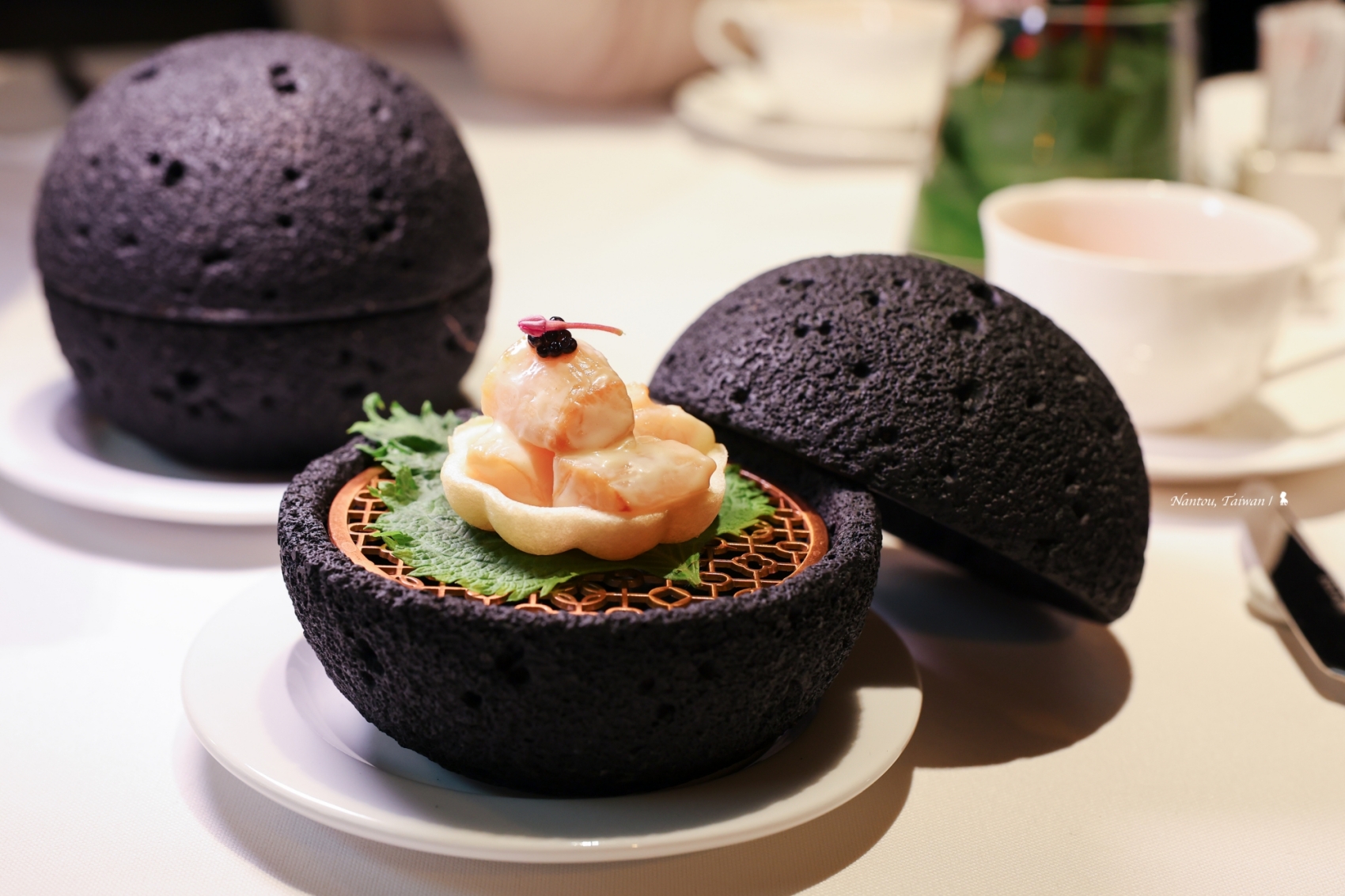 ⇑ 前菜「魚子醬芥末干貝盞」,選用義大利進口魚子醬,與北海道鮮嫩干貝相互融合